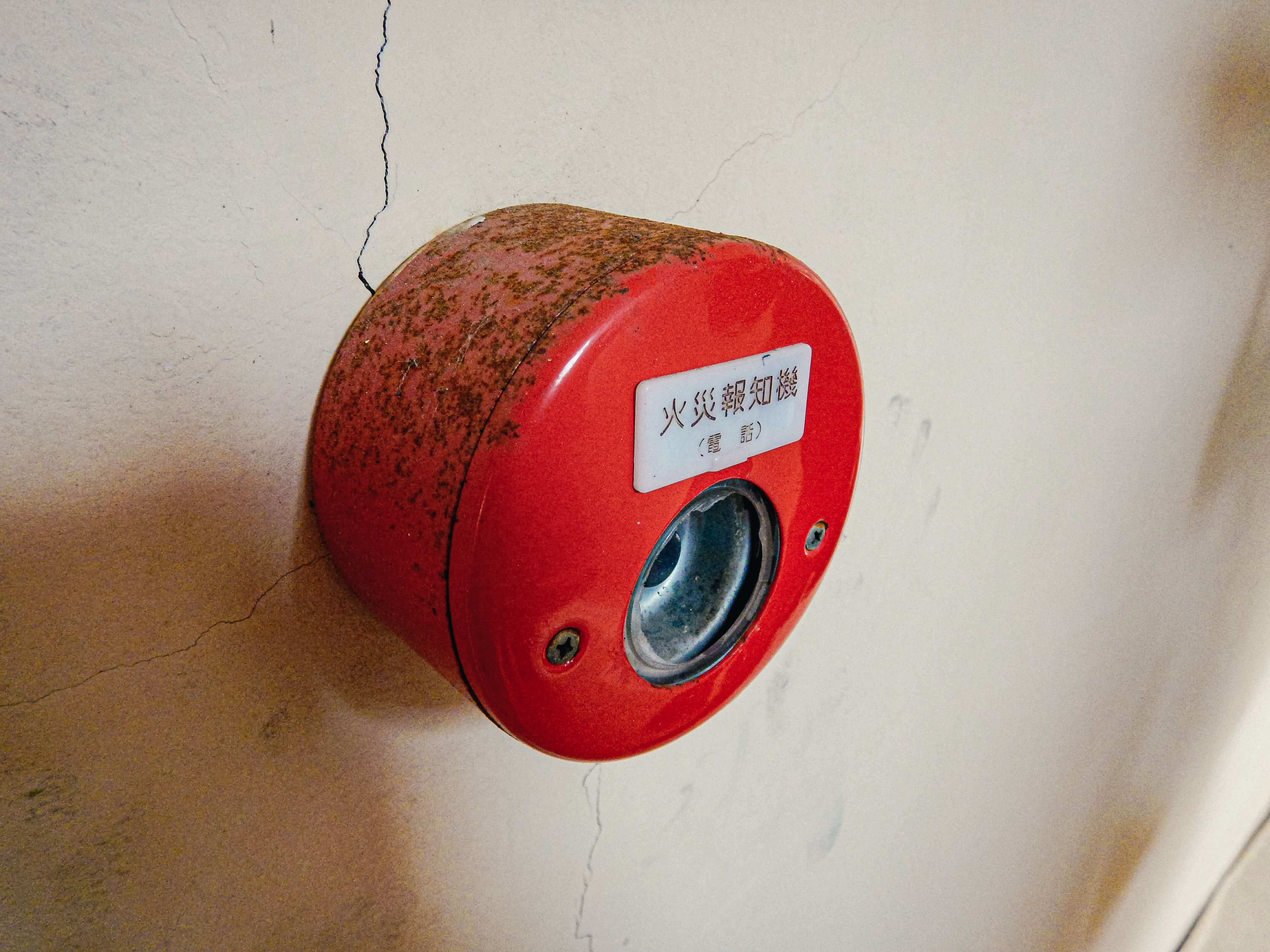 錆びついた火災報知器の写真素材です。赤い本体に錆が浮き出し、全体的にボロボロに劣化した状態で、建物の老朽化を示しています。老朽建築物の資料撮影やホラー・サスペンス系コンテンツ制作、廃墟撮影の素材としておすすめです。