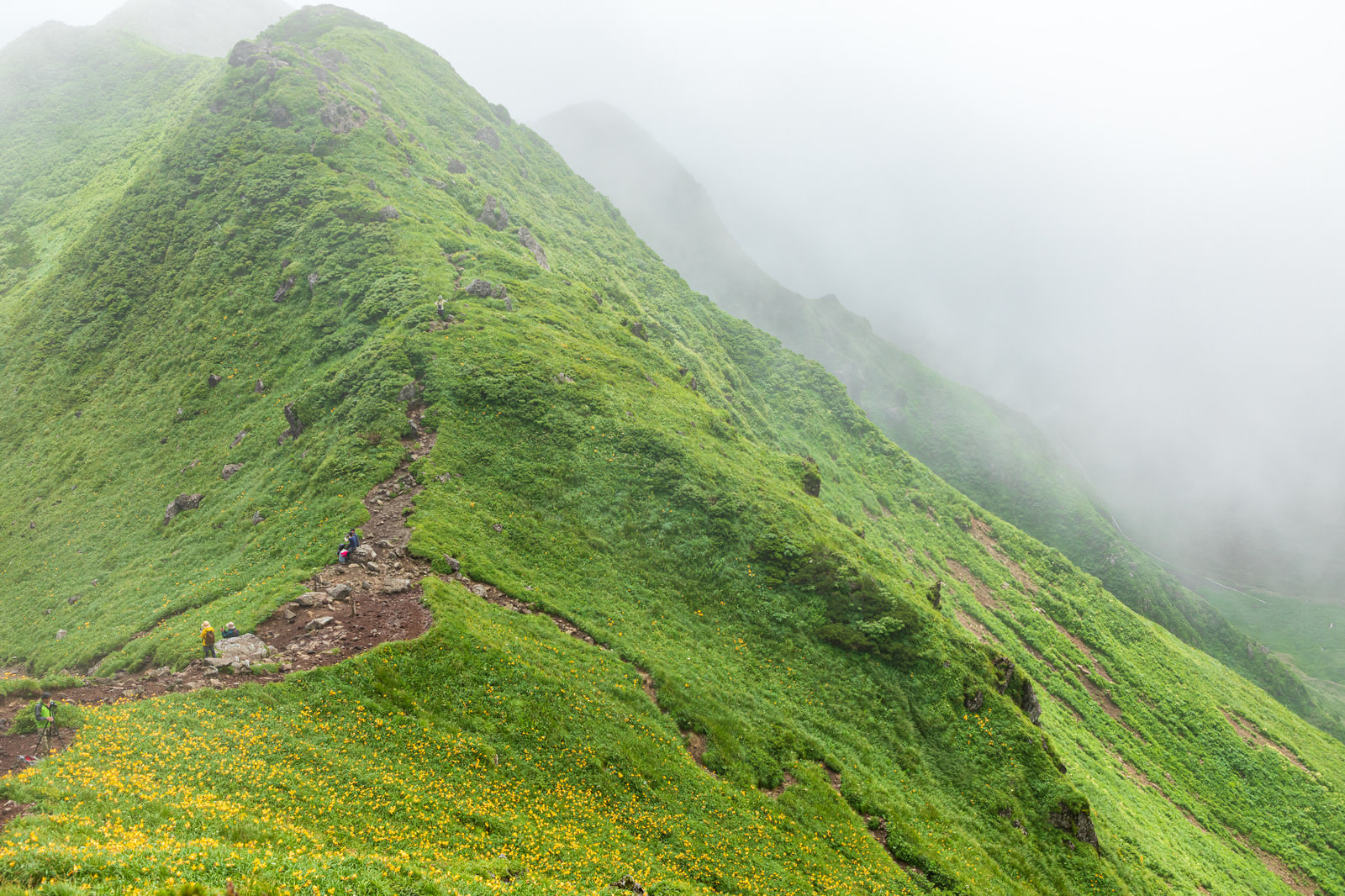秋田駒ヶ岳の稜線の写真素材です。緑の山肌に白いガスが立ち込め、登山道が続いており、高山植物が生い茂る草原が広がっています。遠くに雲海が見え、山岳写真や登山ガイド、観光情報などに活用できます。