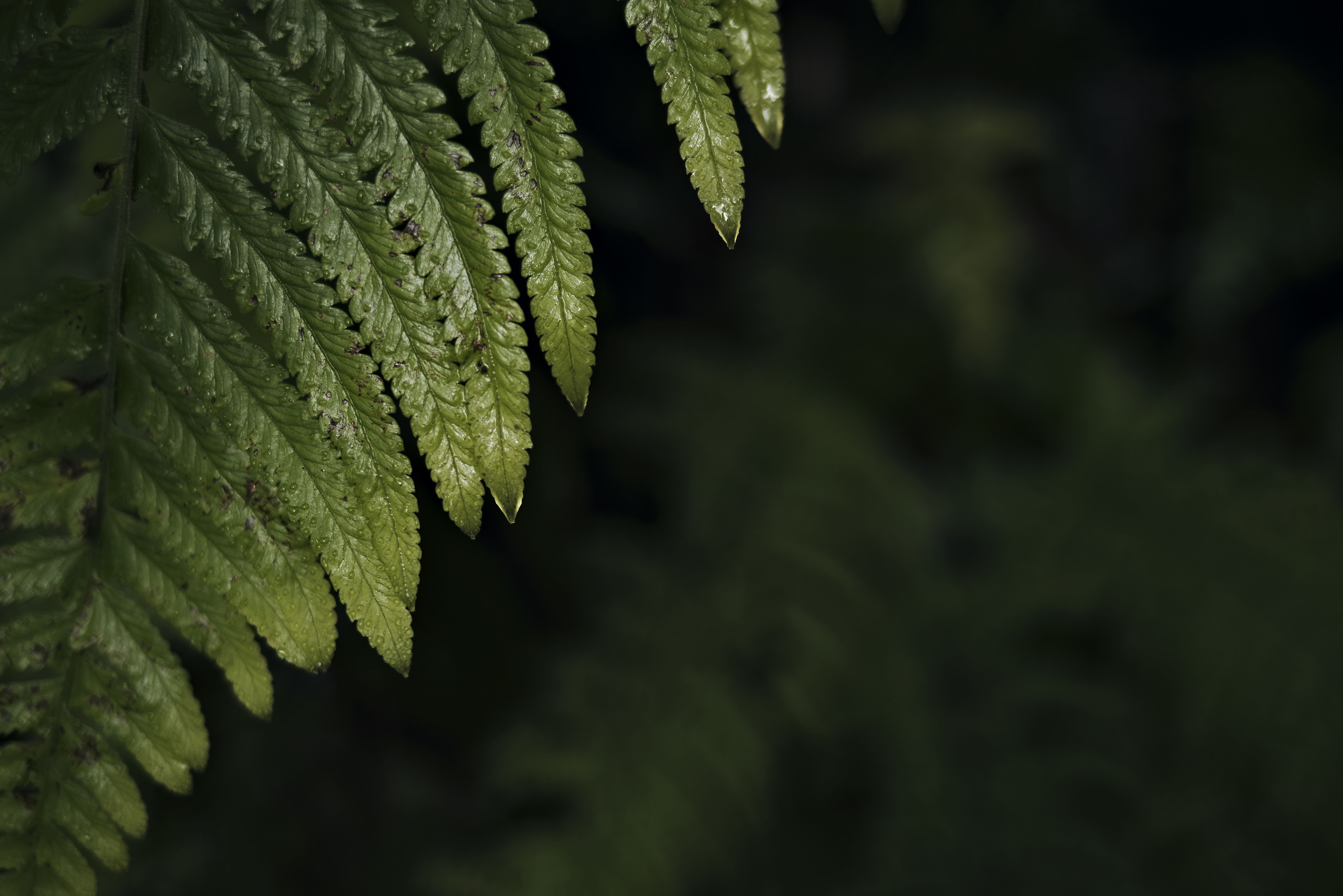 湿った環境に生育するシダ植物の写真素材です。濡れた葉の先端に透明な水滴が付き、葉脈までくっきりと見える。雨や植物をテーマにしたデザインにおすすめです。