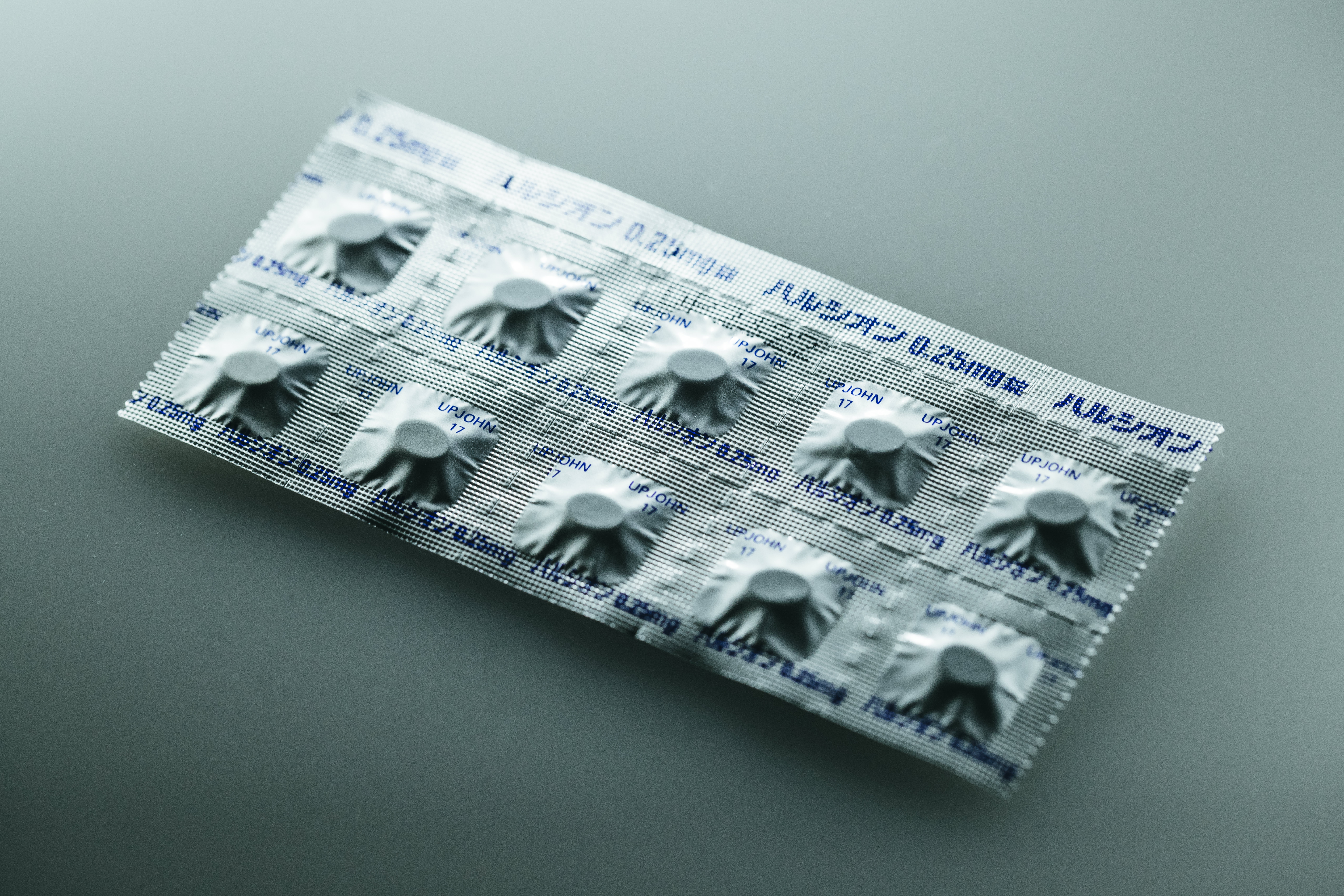 ブリスターパックに入ったハルシオン錠の写真素材です。白いシートに規則正しく配列された睡眠導入剤の錠剤が複数列並んでいます、ハルシオンはトリアゾラム成分を含む処方薬で、短時間作用型の睡眠導入剤として医療現場で使用されています。医療関連の記事や薬剤説明資料、医学教育コンテンツなどにおすすめです。