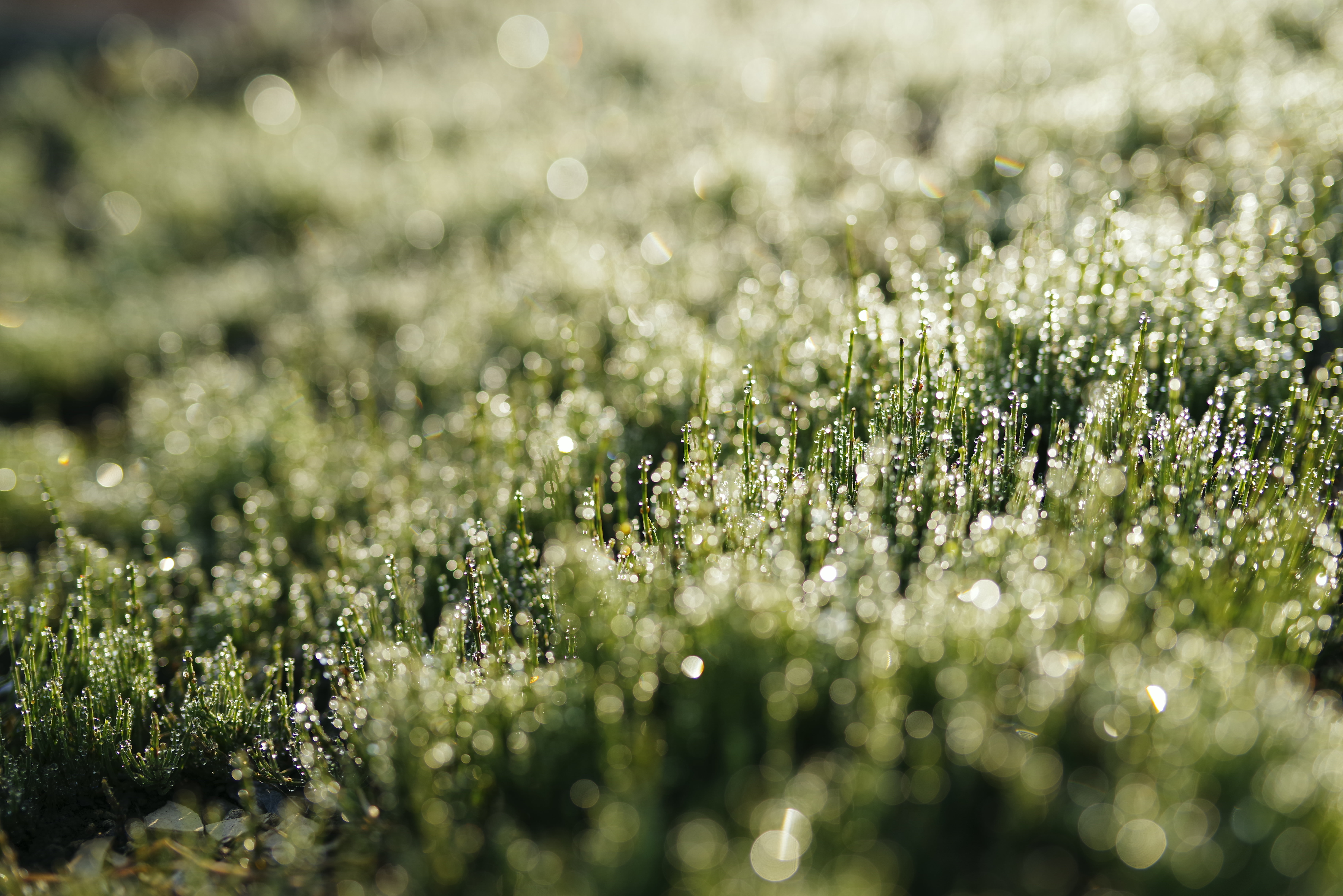 朝露に光り輝くスギナの写真素材です。トクサ科に属するシダ植物のスギナが、細い緑色の茎に朝露の水滴をまとい、光を受けてキラキラと輝く様子が複数株で並んでいます。春先の雑草として知られるスギナの自然な姿が、季節素材やボタニカルテーマのデザイン制作におすすめです。