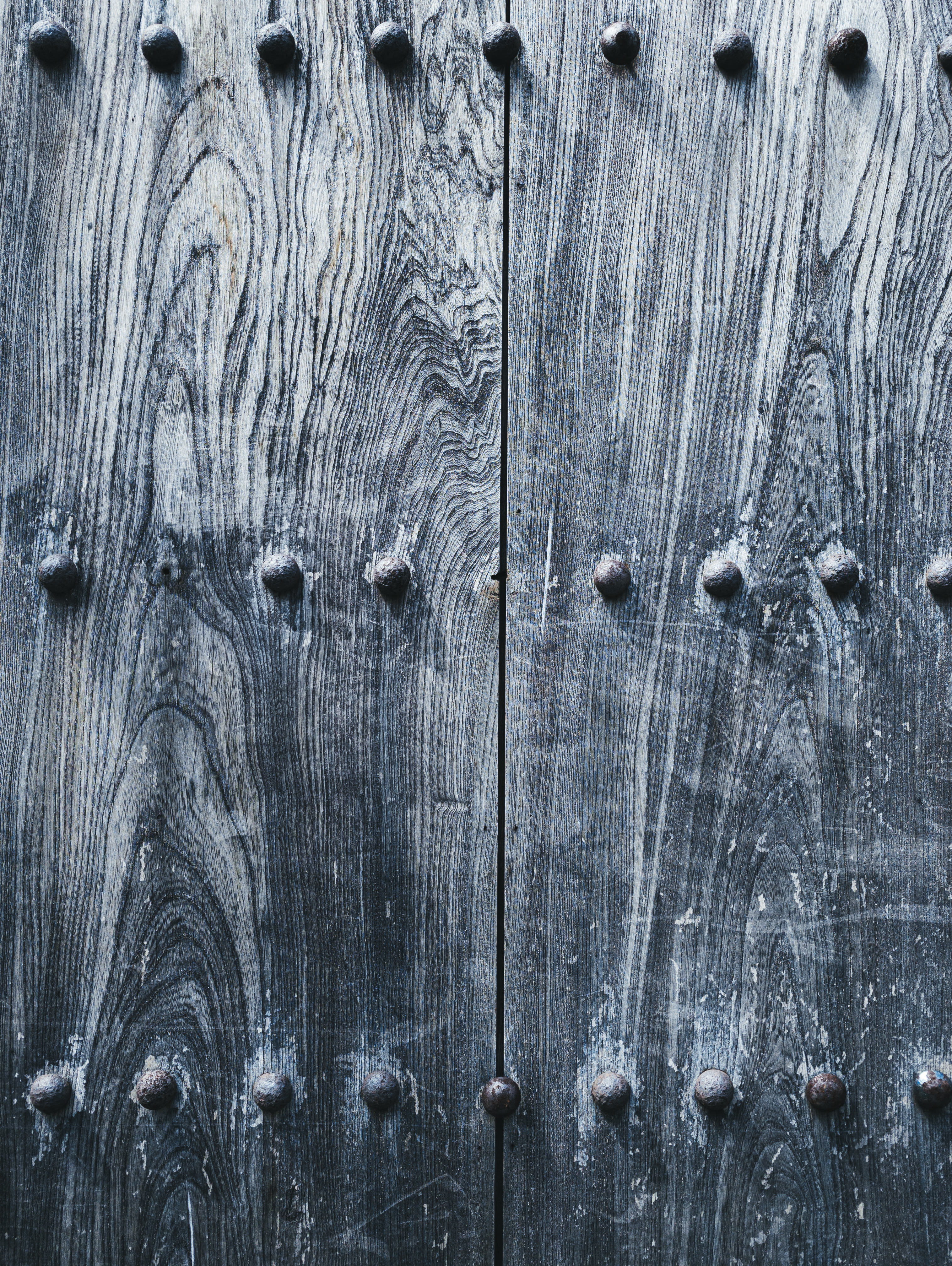 黒い杭が規則的に打ち込まれた木目板の写真素材です。縦に並んだ木の板に黒い杭が等間隔で打ち込まれており、木目の筋と節が随所に見られ、立体的な質感を表現しています。背景デザインやテクスチャー素材、建築関連のコンテンツなどにおすすめです。