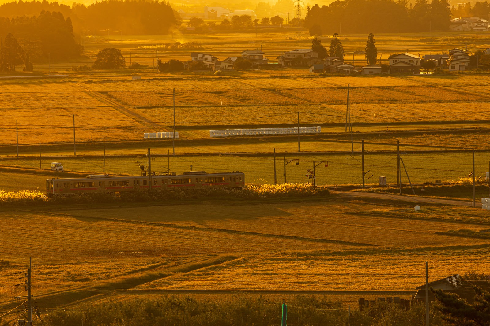 夕暮れの田園を走るローカル電車の写真素材です。黄金色に染まった田園風景の中を走る電車が線路沿いの田畑とともに夕日の光を受けて温かく輝き、日本の原風景を表現するデザイン素材として活用できます。ローカル線の素朴な風情と夕景の美しさを組み合わせた、郷愁的な雰囲気が特徴です。