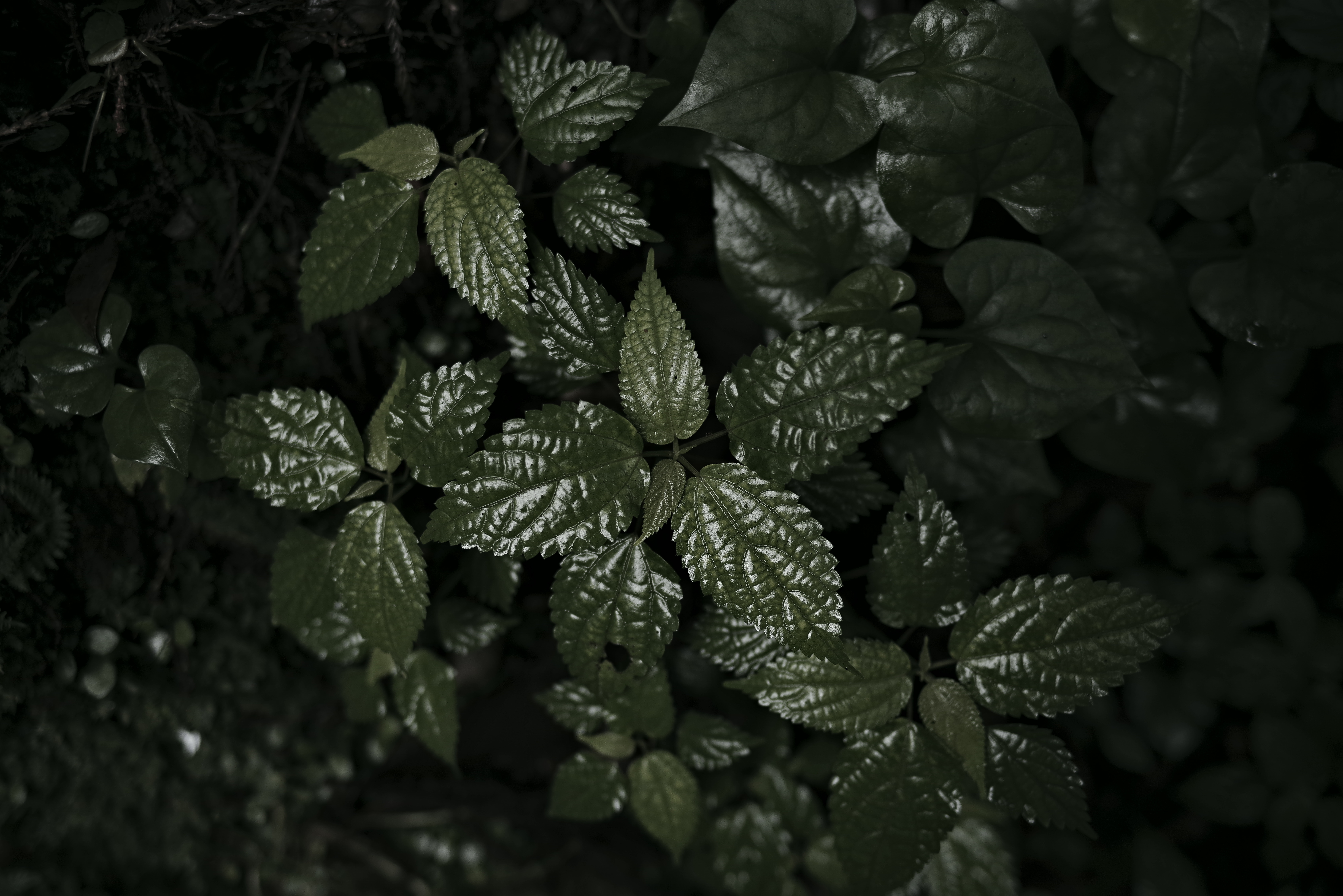 エナメルのような艶を放つ草の写真素材です。緑の葉が重なり合い、光のあたった表面に光沢が生まれ、みずみずしい質感が明確に表れています。自然の生命力を映し出す優れた葉の状態を捉えており、自然をテーマにしたデザインや植物関連のコンテンツなどにおすすめです。