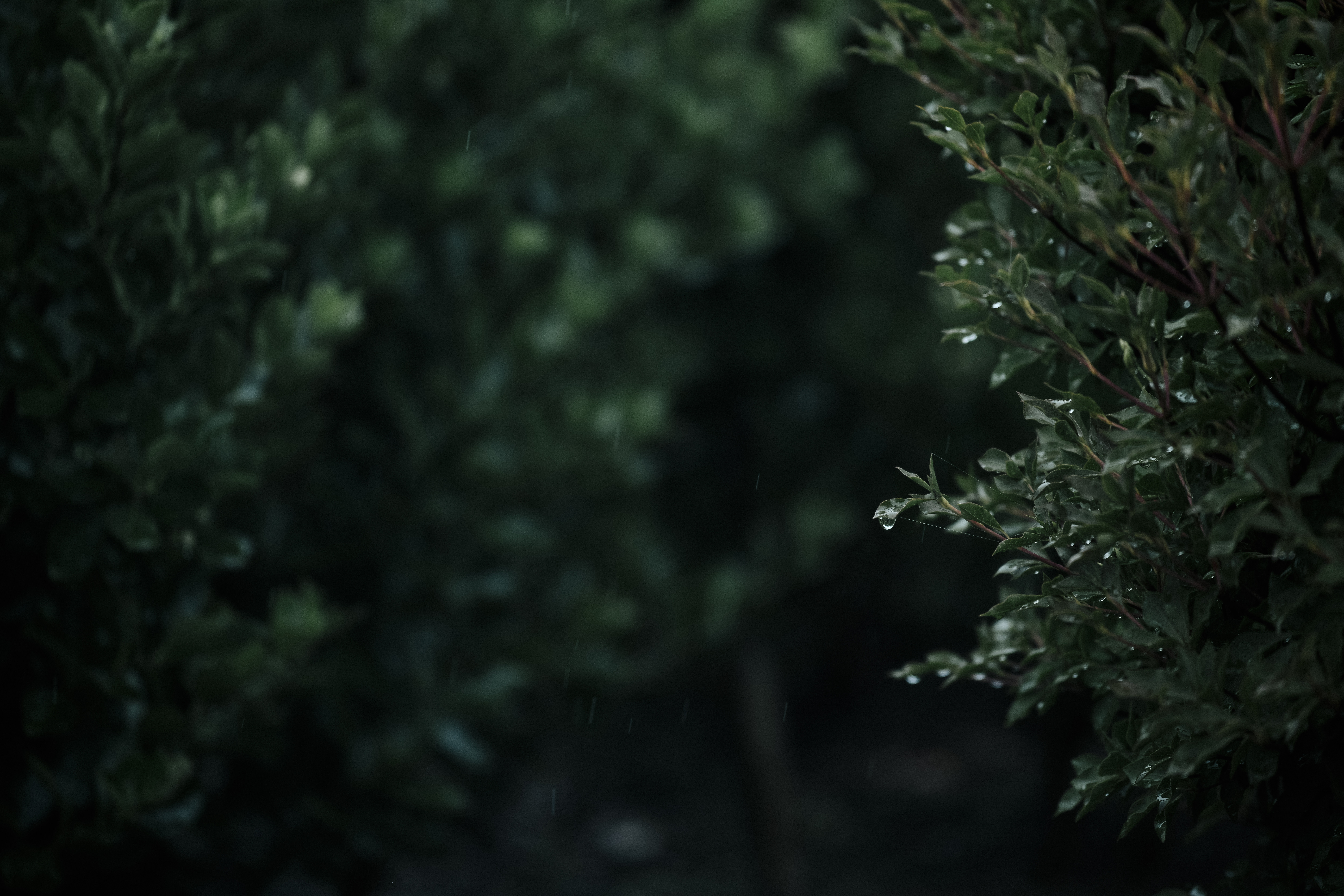 緑の葉に付いた水滴の写真素材です。濃い緑色の葉の表面に透明な水滴がいくつも付着し、背景は深い緑色でぼかされた梅雨の季節感を表現したイメージです。雨粒や雫の繊細な表現は、季節感を活かしたデザインや自然・環境をテーマにしたコンテンツ制作に活用できます。