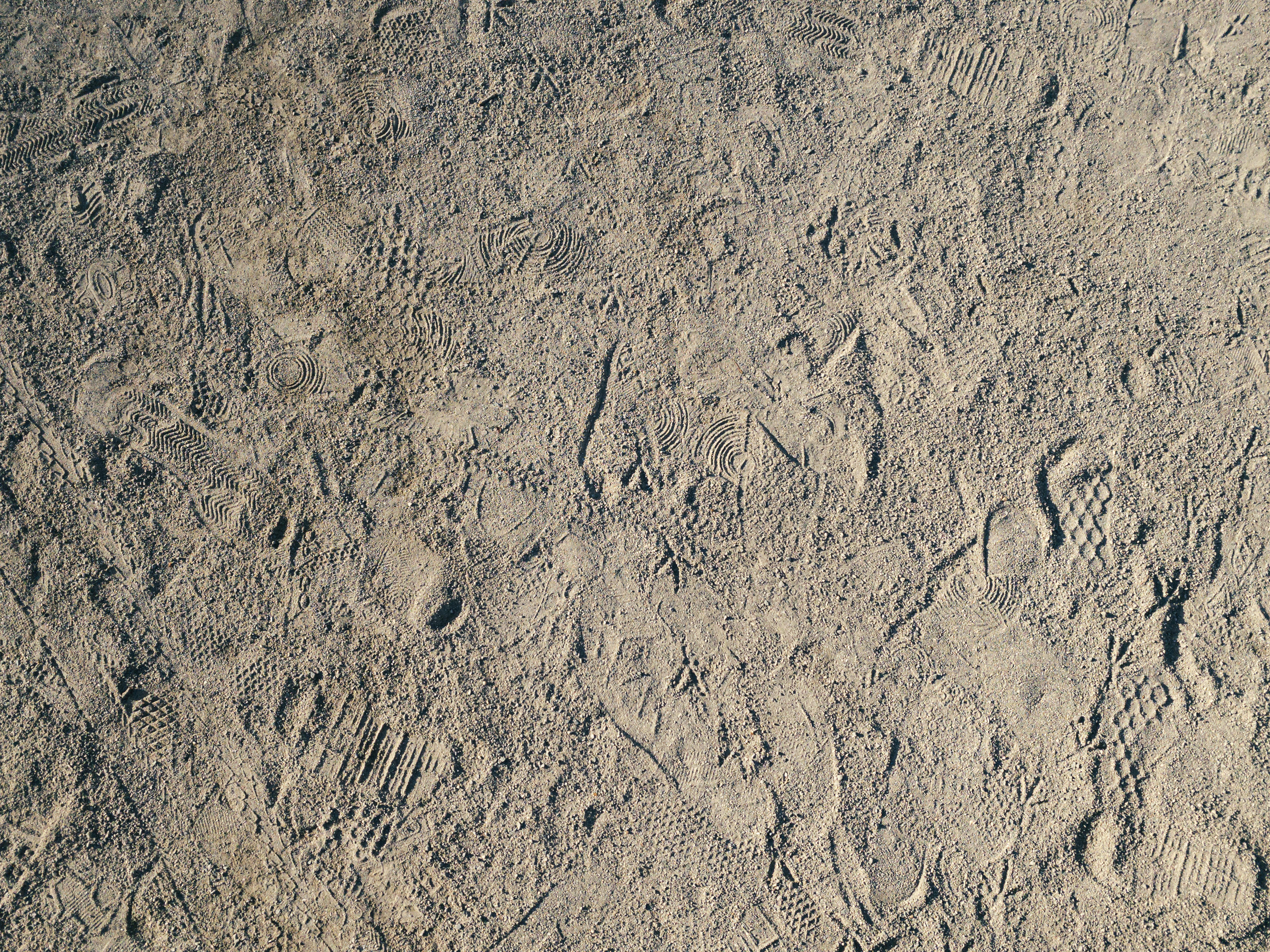 地面一面に残る靴跡とテクスチャーの写真素材です。乾いた土や砂の地面に無数の足跡が刻まれており、踏み固められた跡の陰影が素材感を強調しています。複雑な模様と自然な質感を形成しているため、背景デザインやテクスチャー素材などにおすすめです。