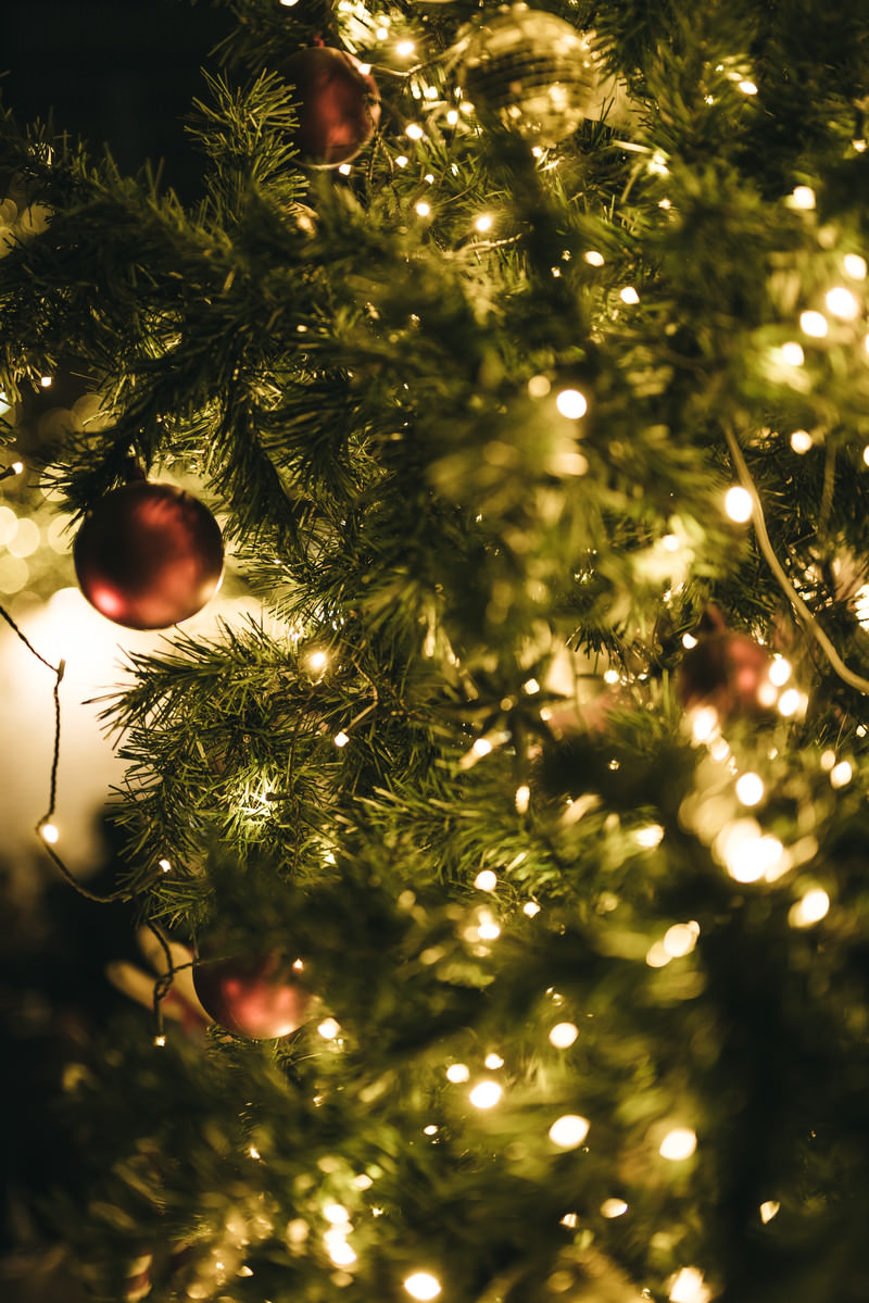 ライトアップされたクリスマスツリーの写真素材です。温かい光の電飾とオーナメントで飾られたツリーが暗い背景の中で輝き、先端から根元まで色とりどりの装飾が施されています。クリスマスイベントやホリデーシーズンの装飾、冬関連のコンテンツ制作などにおすすめです。