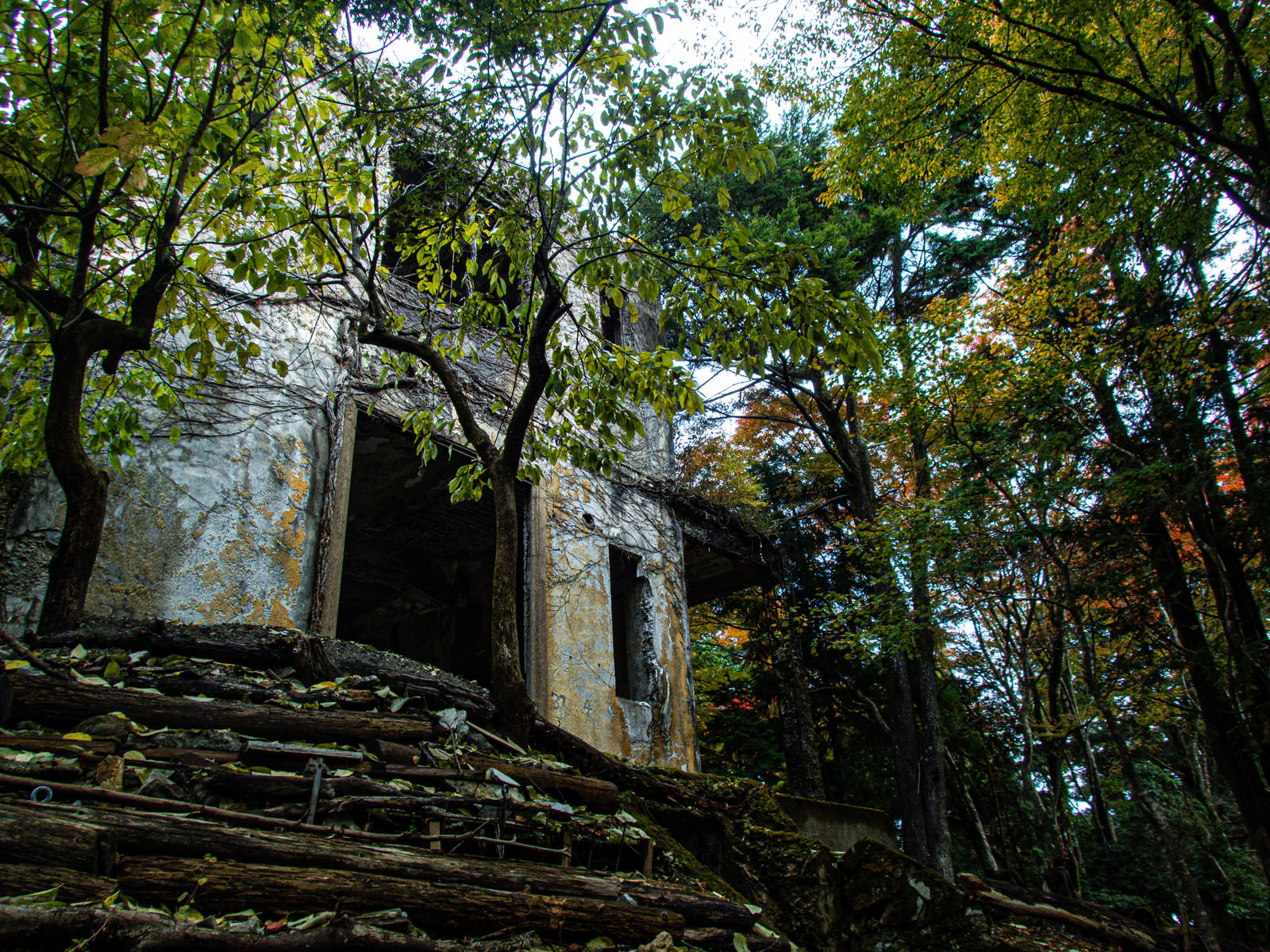 森の中のケーブルカー駅舎跡の写真素材です。緑豊かな木々に囲まれた廃屋が、苔むした石段とともに静かに佇んでおり、かつての交通施設の歴史と自然が融合した遺跡の景観をご覧いただけます。古い建造物と豊かな森林環境の共存を記録した素材として活用できます。
