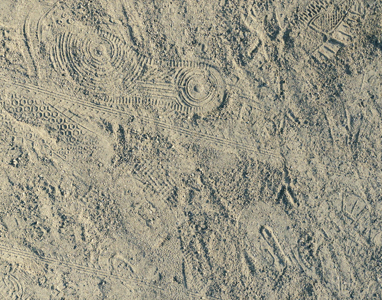 砂地の地面に付いた無数の足跡の写真素材です。大小さまざまな靴跡と足跡が重なり合い、複雑に交差した自然なテクスチャーパターンを形成しており、地面の凹凸と質感をリアルに表現しています。グラウンドやダート地面の背景デザインやテクスチャー素材などにおすすめです。