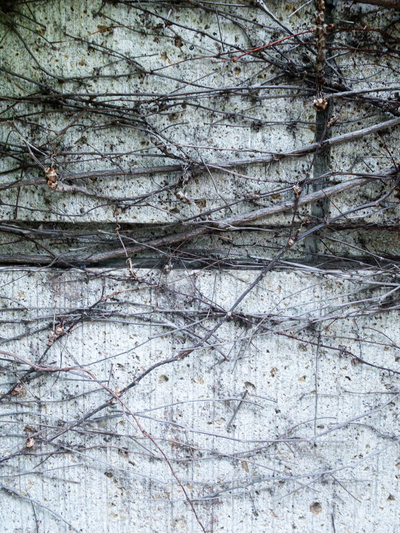 コンクリート塀に這う蔓の写真素材です。白いコンクリート壁面に細い蔦やつるが複雑に絡みつき、自然物と人工物が共存する状態を記録しています。長年かけて形成された有機的な模様は、建築資料やテクスチャー素材、造園デザイン関連のコンテンツ制作におすすめです。