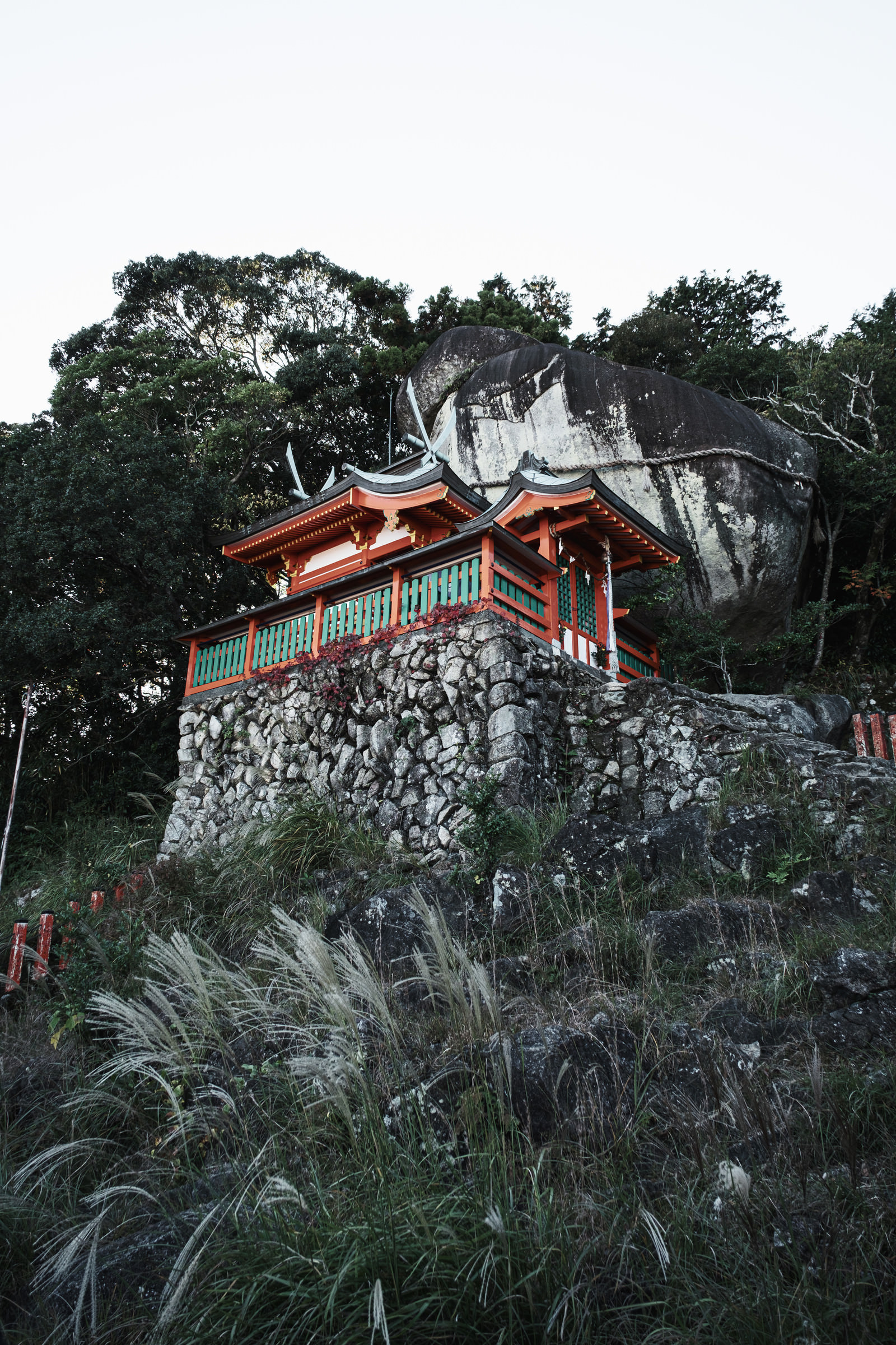 Kamikura Shrine and Gotobiki Rock Rising Above Stone Walls