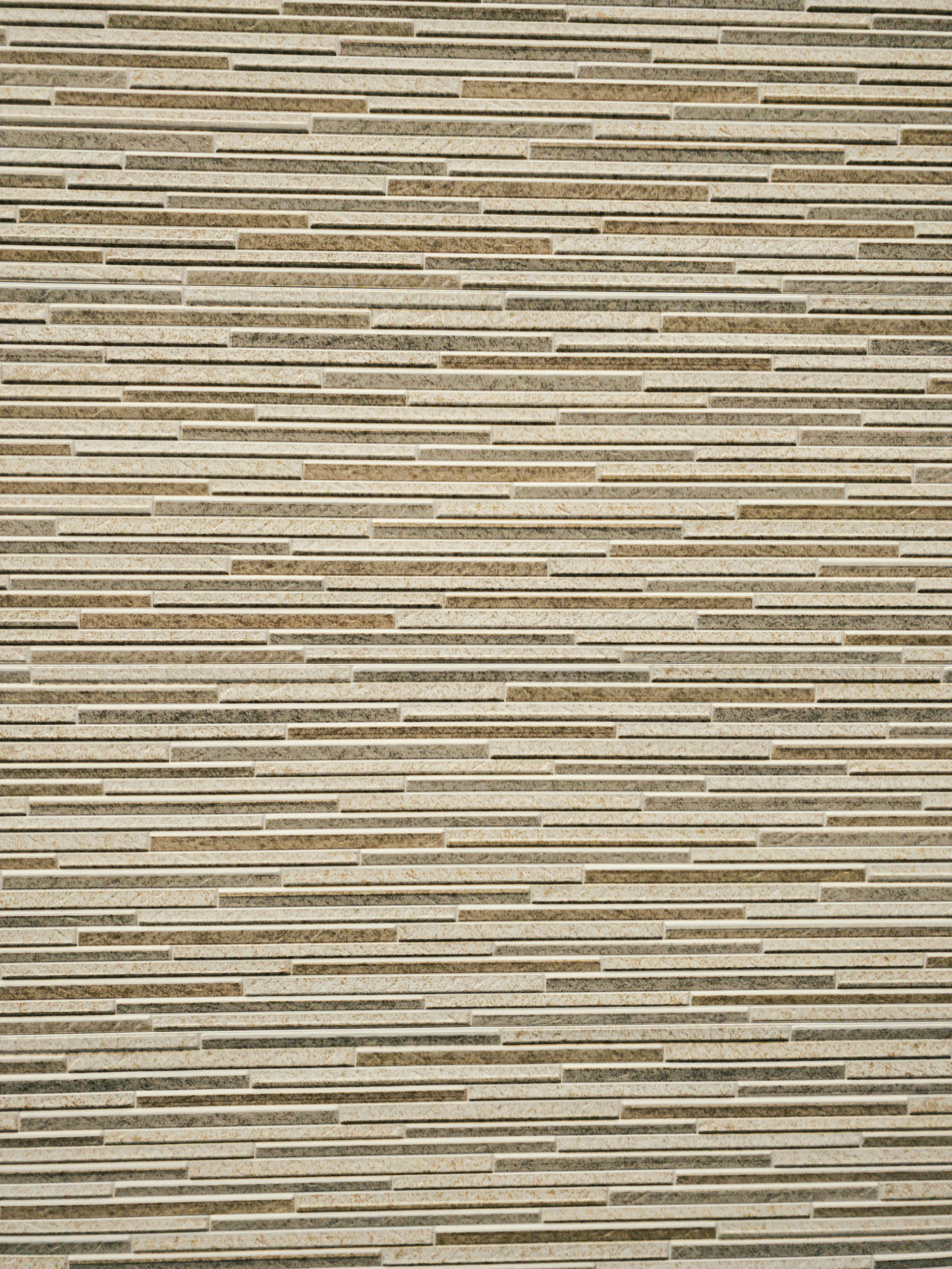 細長いタイルが横に並んだ外壁の写真素材です。ベージュ系の色合いで統一された細長いタイルが規則正しく配置され、水平方向のストライプ模様を形成しています。外壁の質感や素材感を表現する建築関連資料や、外装デザイン、インテリア参考資料などにおすすめです。