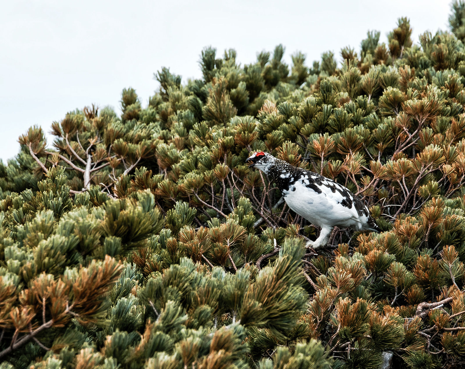 縄張りを確保するオスの雷鳥の写真素材です。茶色と白の羽毛を持つ雷鳥が緑の低木の中に佇み、警戒するような表情を見せています。高山植物が生い茂る山岳地帯に生息する雷鳥の生態を観察できる資料として、野鳥観察や自然関連のコンテンツにおすすめです。