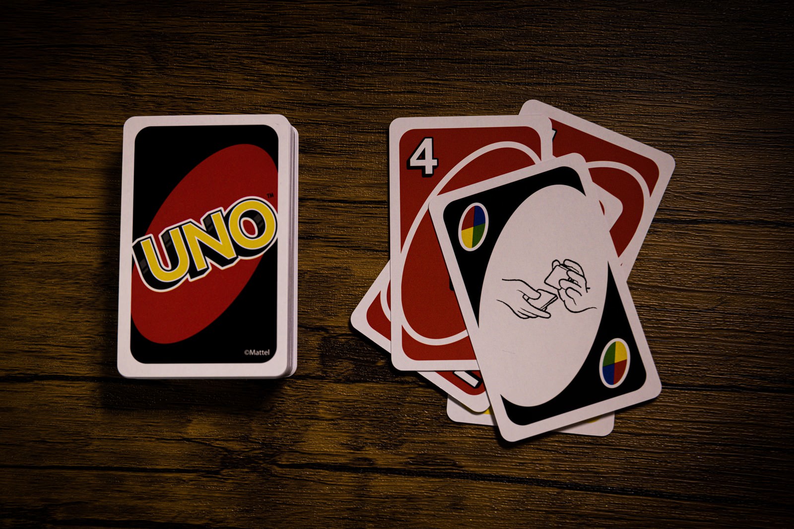 UNOのカードをテーブルに広げた写真素材です。山札の横にシャッフルワイルドやワイルドドロー4などの特殊カードが重なって置かれている。ゲーム紹介やホームパーティの記事などにおすすめです。