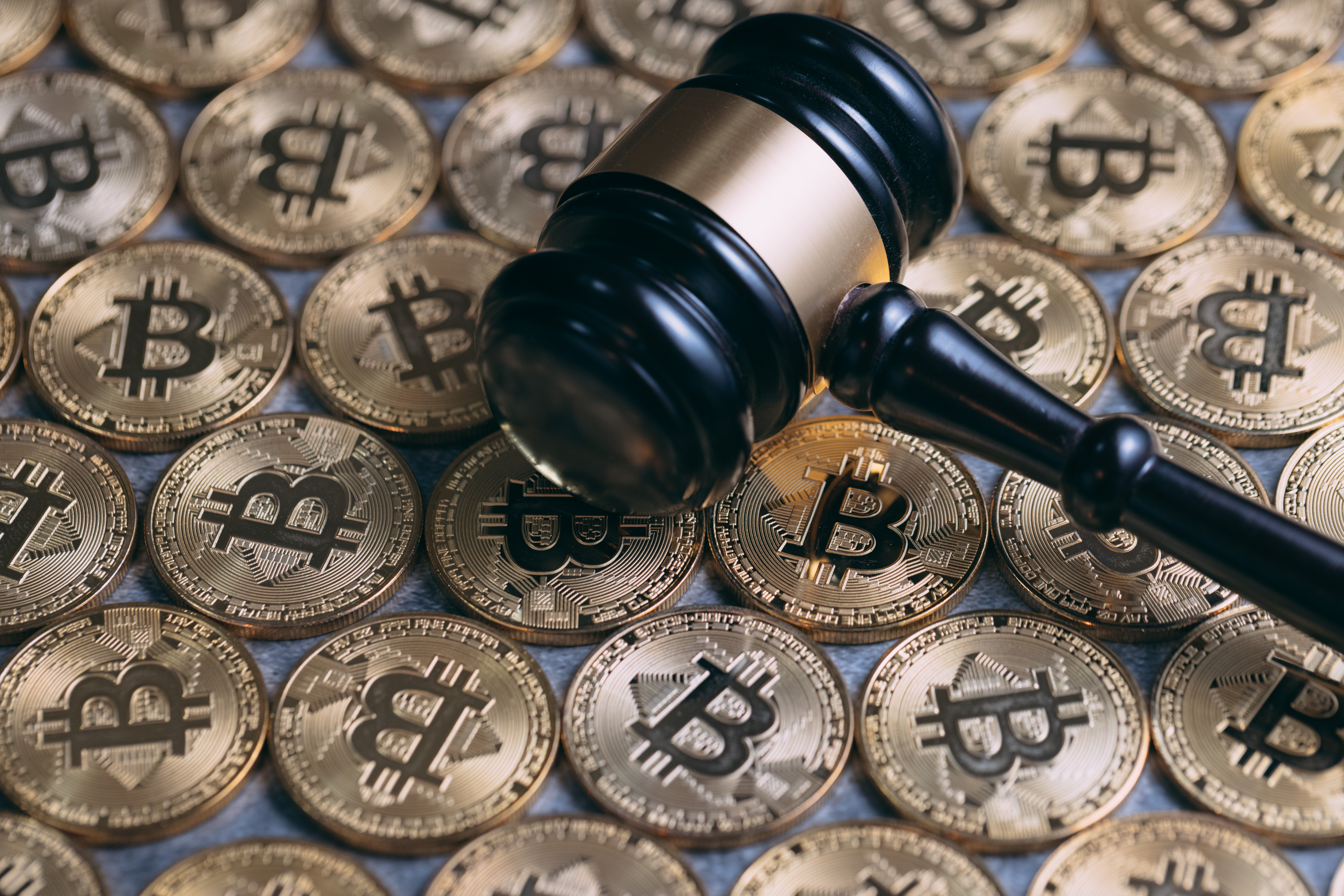 ビットコインのコインと小槌が並ぶ写真素材です。金色のビットコインと木製の小槌が対比的に配置され、仮想通貨と法的判断の関係を視覚的に表現しており、暗号資産の裁判や法廷での取扱い、金融規制に関する記事制作におすすめです。