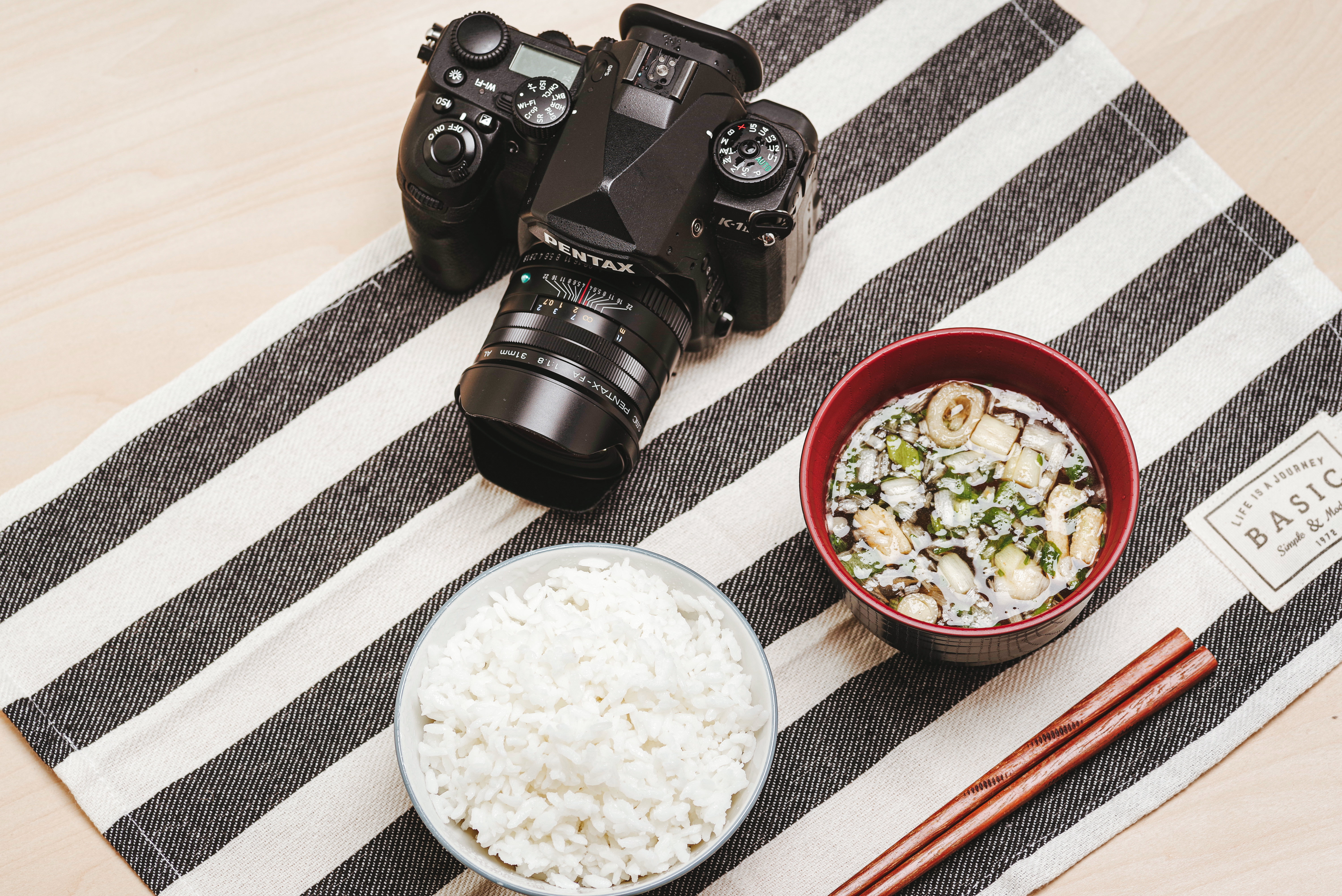 カメラと朝食の写真素材です。黒いストライプの布の上にPENTAXの一眼レフカメラが置かれ、横に白いご飯の入ったお茶碗、味噌汁、箸が配置されたペンタメシの風景。朝食や和食をテーマにしたコンテンツ制作、カメラ関連の記事、ライフスタイル素材などにおすすめです。