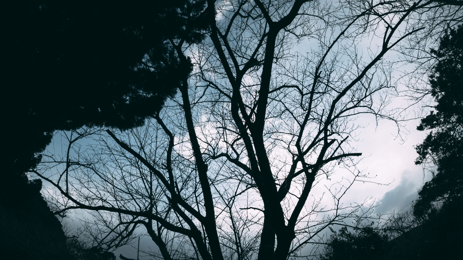 空に映る木と森の影絵の写真素材です。暗いシルエットの木々が複雑に枝を絡み合わせ、青空を背景に黒く浮かび上がり、明暗の対比で独特の構図を呈しています。ホラー系やダーク表現のデザイン、背景素材として活用できます。
