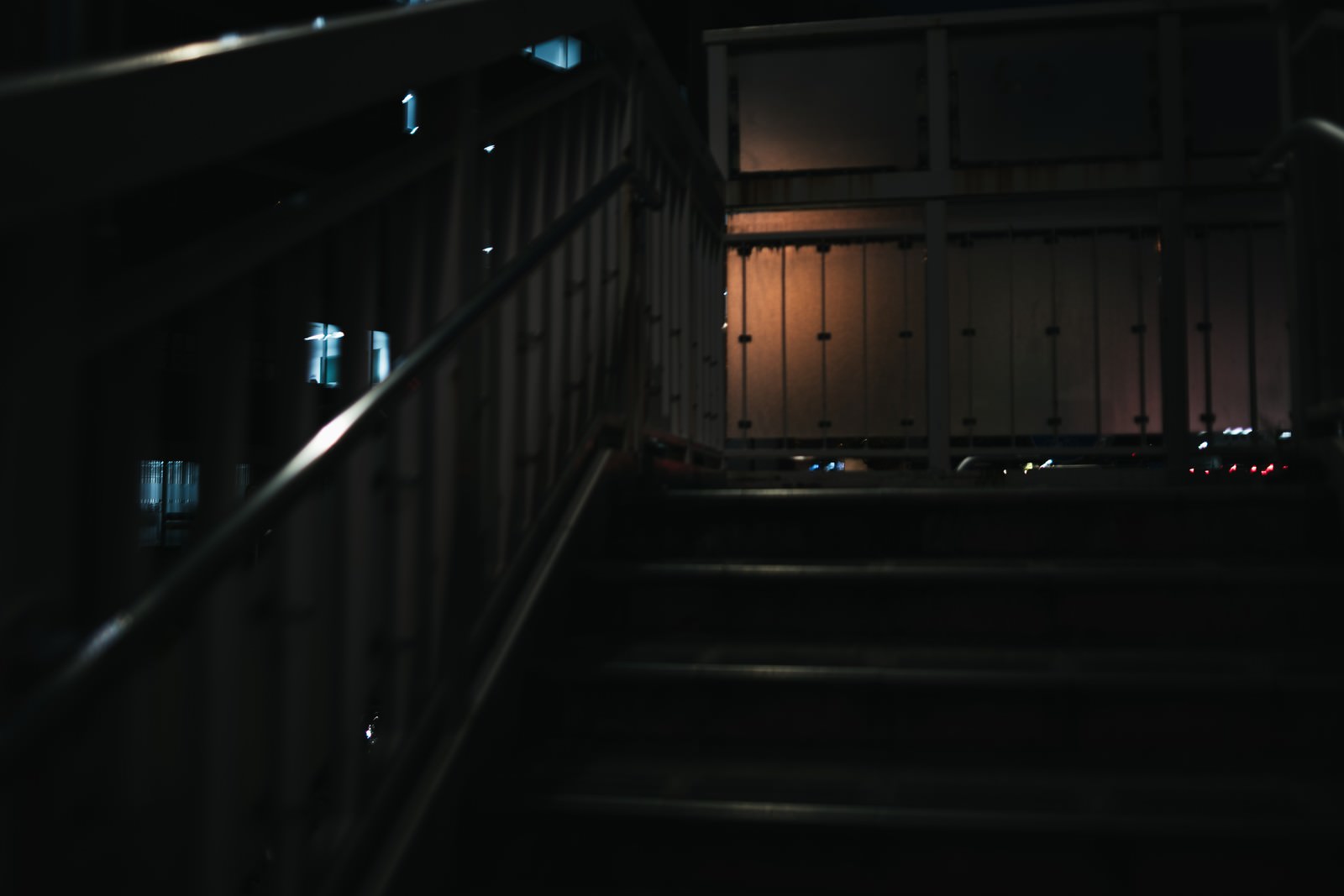 夜の歩道橋の目隠しの写真素材です。暗い中で街灯の明かりが目隠しの隙間から透けて見え、階段の手すりや建造物のシルエットが暗闇に浮かび上がっています。夜景やアーバンシーンの素材として活用できます。