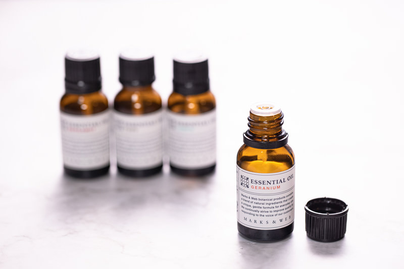 茶色のガラス瓶に入ったエッセンシャルオイルの写真素材です。数本の精油瓶が並んでおり、手前の瓶はキャップが開いて中身が見える状態、複数の香りの瓶が並ぶ様子が特徴です。アロマテラピーやリラクゼーション、香りを扱うデザイン制作に活用できます。