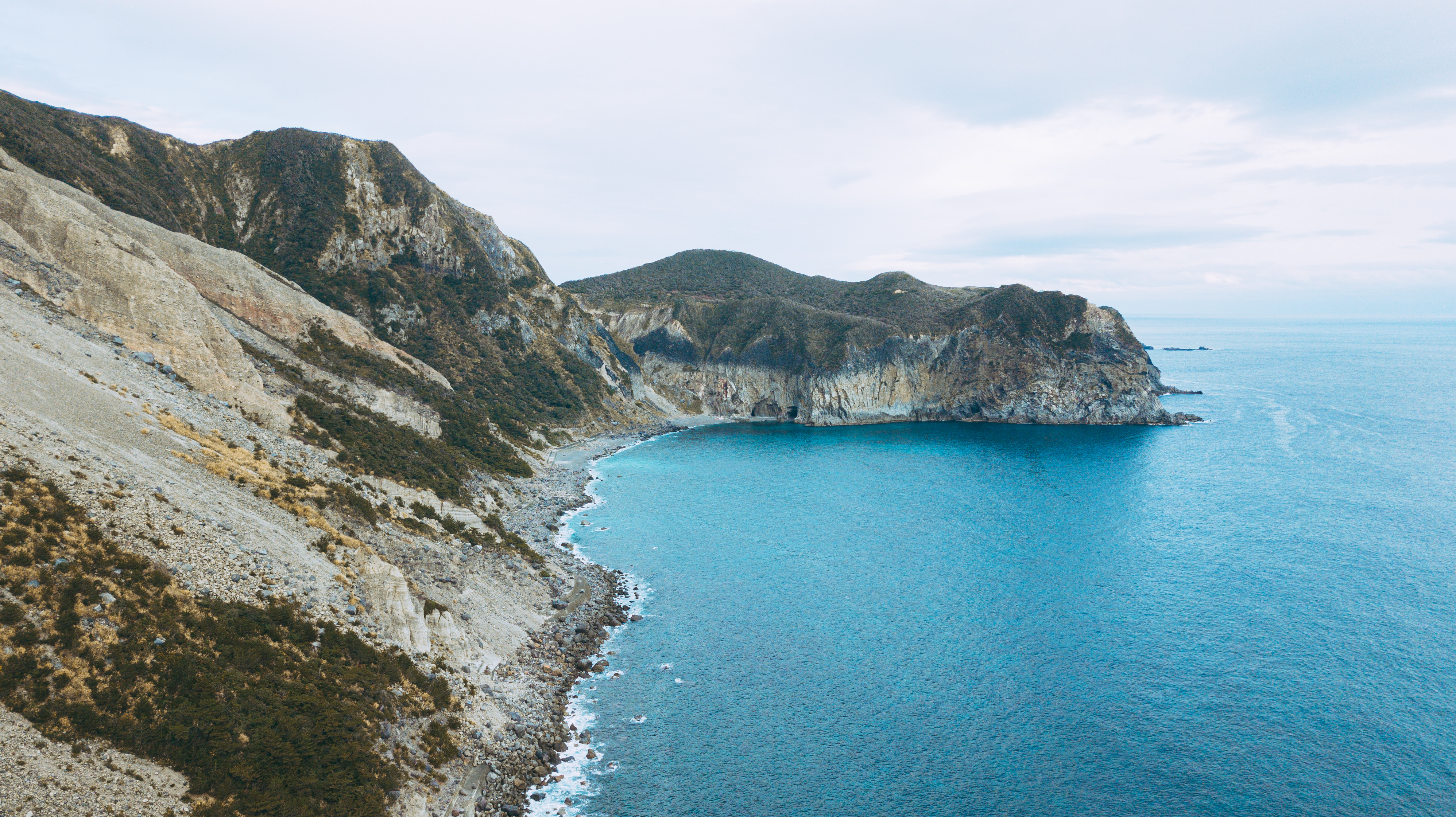 多幸湾上空から砂糖山方面を撮影した写真素材です。青い海に囲まれた急峻な断崖絶壁の地形が広がり、白い岩肌を露出させた砂糖山の独特な山容が眼下に見えます。神津島の地形的特徴を示す俯瞰景観で、観光情報や旅行ブログなどに最適です。