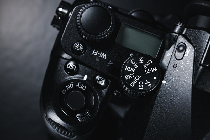 PENTAX K-1 MarkⅡの電子ダイヤル部の写真素材です。カメラ上部に複数の回転ダイヤルと操作ボタンが配置され、黒を基調とした質感の高いボディに統一されています。カメラ機材の紹介やレビュー記事、デジタル一眼レフの解説コンテンツなどに活用できます。