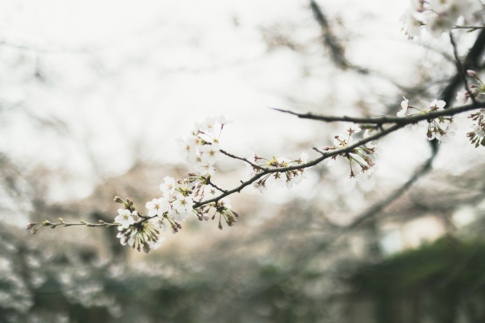 A cherry blossom branch beginning to bloom