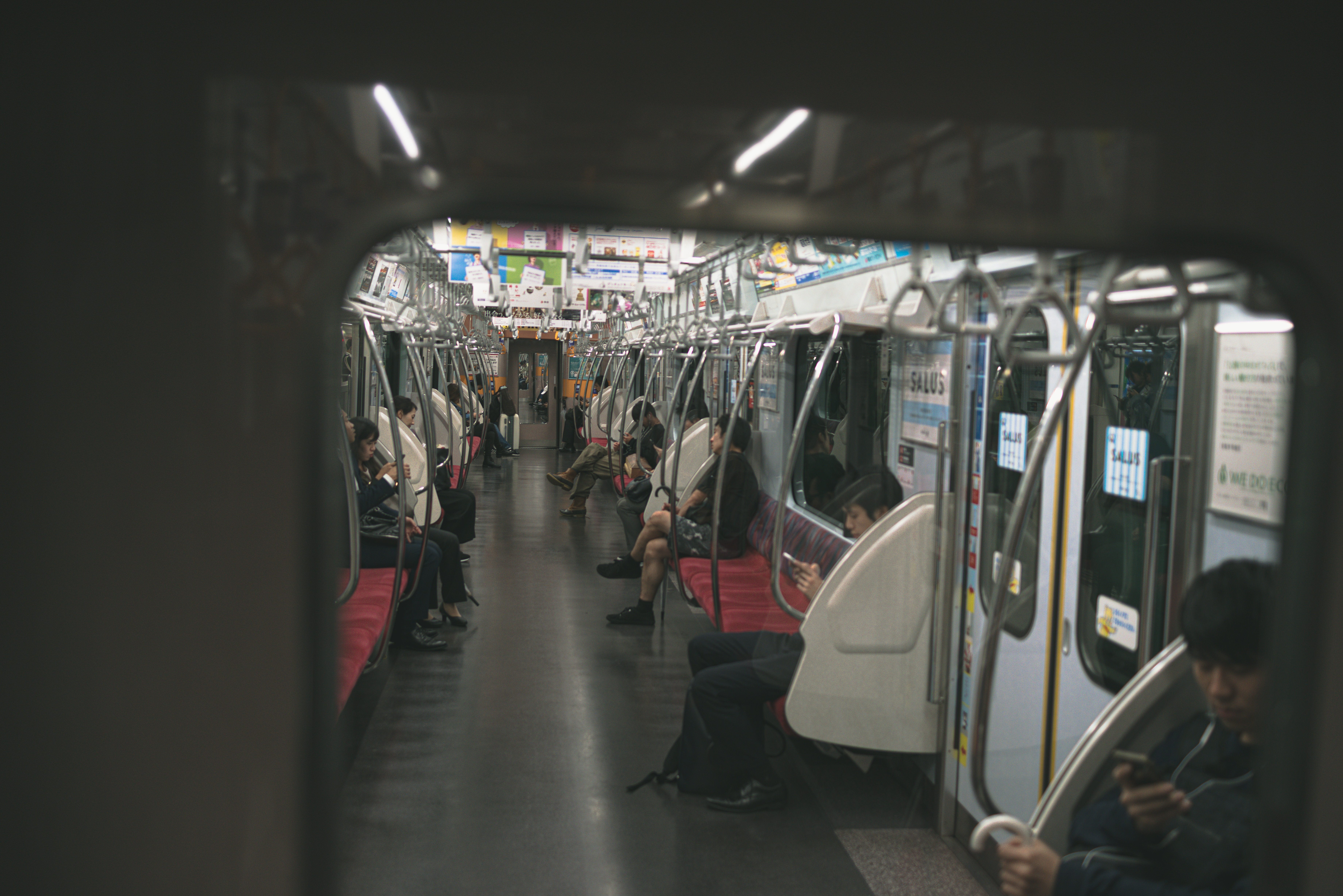 電車内の乗客の写真素材です。車内に並ぶ座席の端に座る乗客が移動中の様子を捉えており、背景には車両内部の座席配置が映っています。通勤・通学シーンや公共交通関連のコンテンツ制作などにおすすめです。