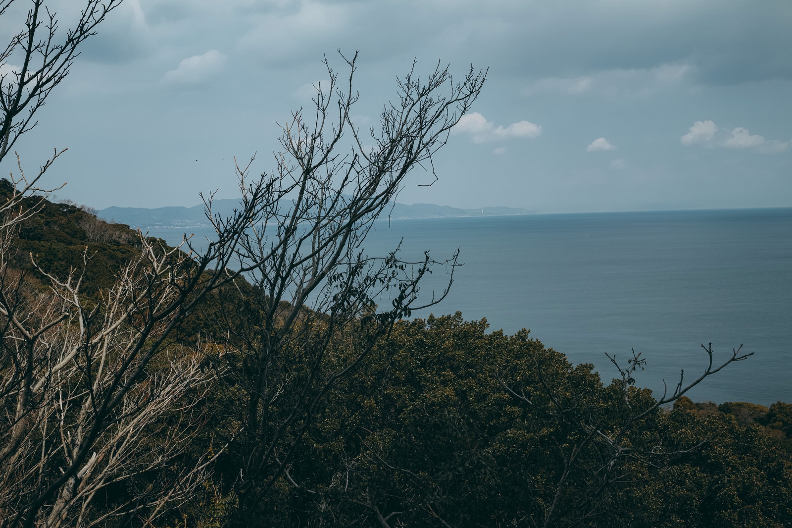 森と海が見える風景の写真素材です。曇り空の下で手前の暗い樹木が林立し、その向こうに遠くの海岸線が見える構図になっています。陰鬱な雲に覆われた自然風景は、環境テーマの企画や文芸的な背景画像などにおすすめです。