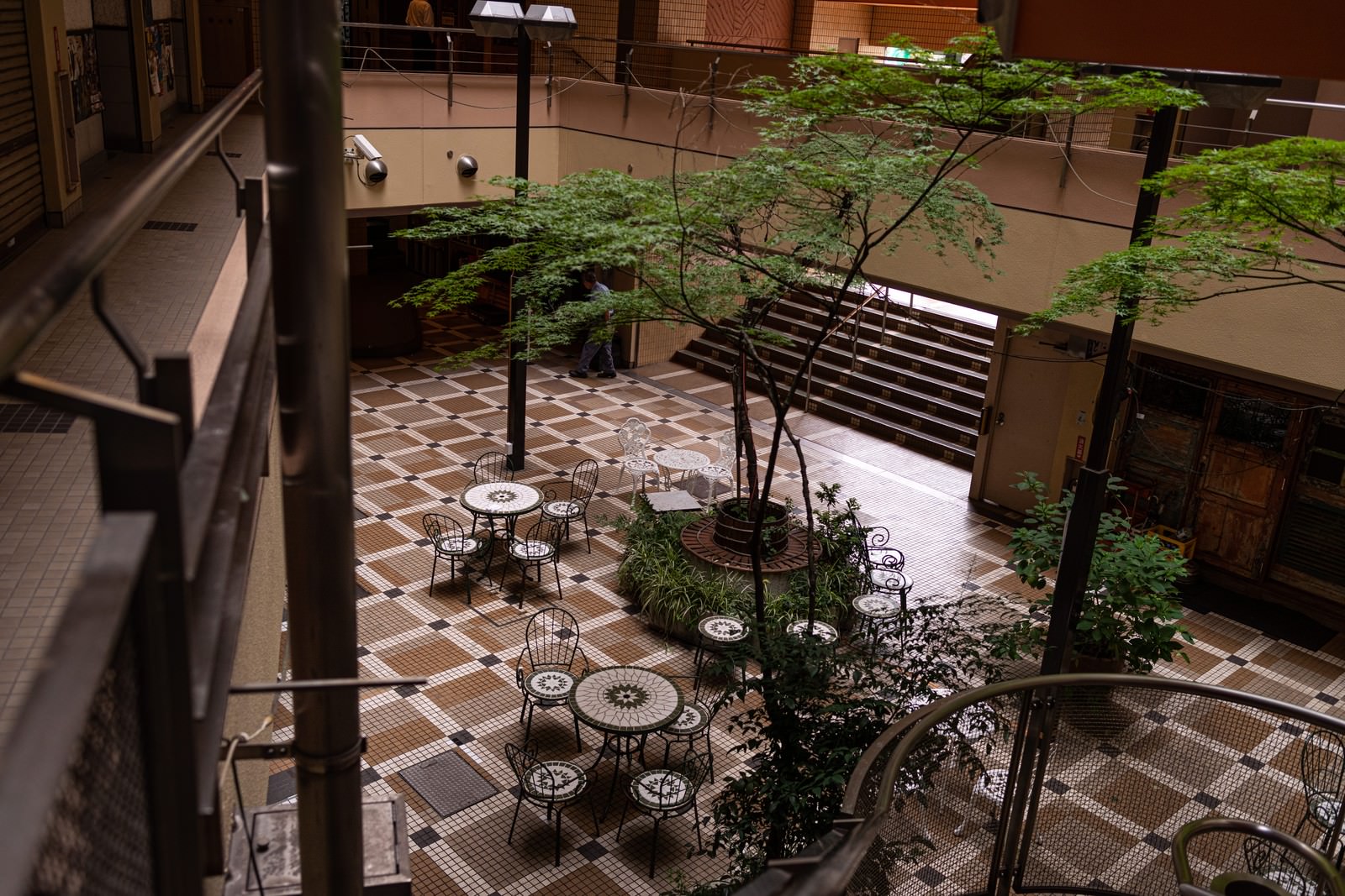 五反田ヒルズのニコニコタウン中庭テラスを上から撮影した写真素材です。白いテーブルセットが石畳の床に複数配置され、周囲に緑の植物が植えられている空間の全体像が見えます。施設紹介やコマーシャル撮影、不動産関連のコンテンツ制作などに活用できます。