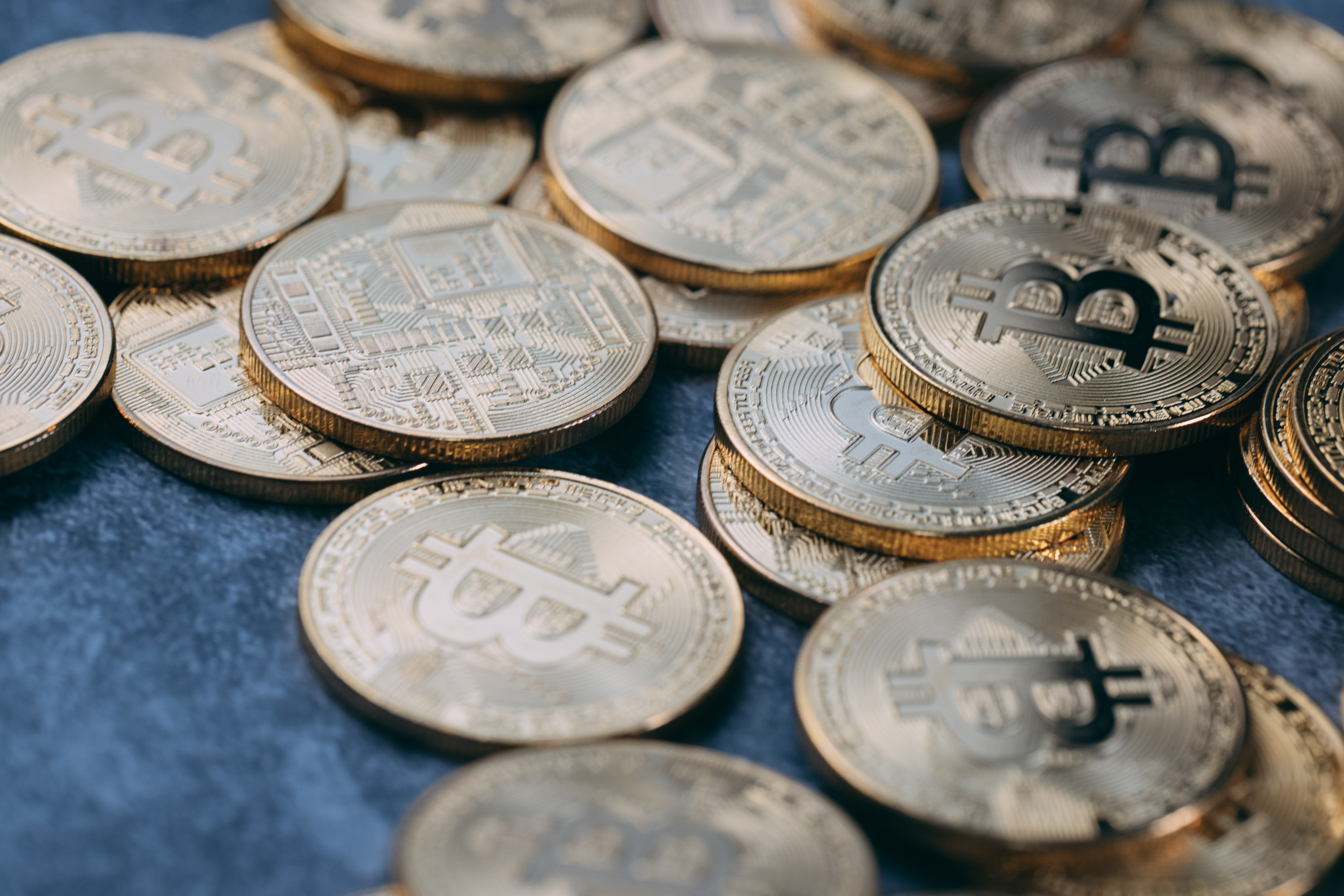 散らばるビットコインメダルの写真素材です。金色のビットコインメダルが青い背景に無造作に配置され、BTCのシンボルマークが刻印されています。仮想通貨や暗号資産の象徴的なイメージとして、投資や金融関連の記事、資産運用に関する資料制作などにおすすめです。