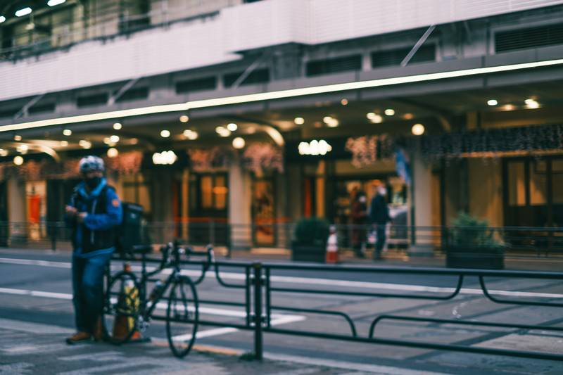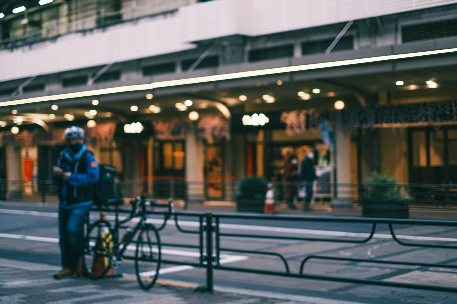 自転車を降りた街角の配達員の写真素材です。歩道に停められた自転車の横に立つ配達員が、ポーチを持ちながら配達の準備をしている様子を表現した一枚で、フードデリバリーサービスや宅配業界の記事、街の風景を表現するコンテンツなどにおすすめです。
