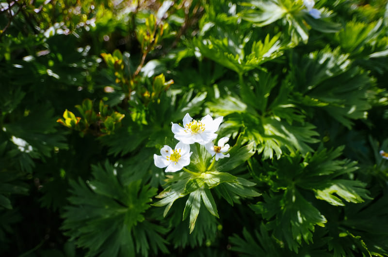 表銀座登山道に咲くハクサンイチゲの写真素材です。高山植物の多年草で、細い茎の先に白い花弁が放射状に開く様子が見られます。登山ガイドや山岳関連のWebサイト、自然をテーマにしたブログなどにおすすめです。