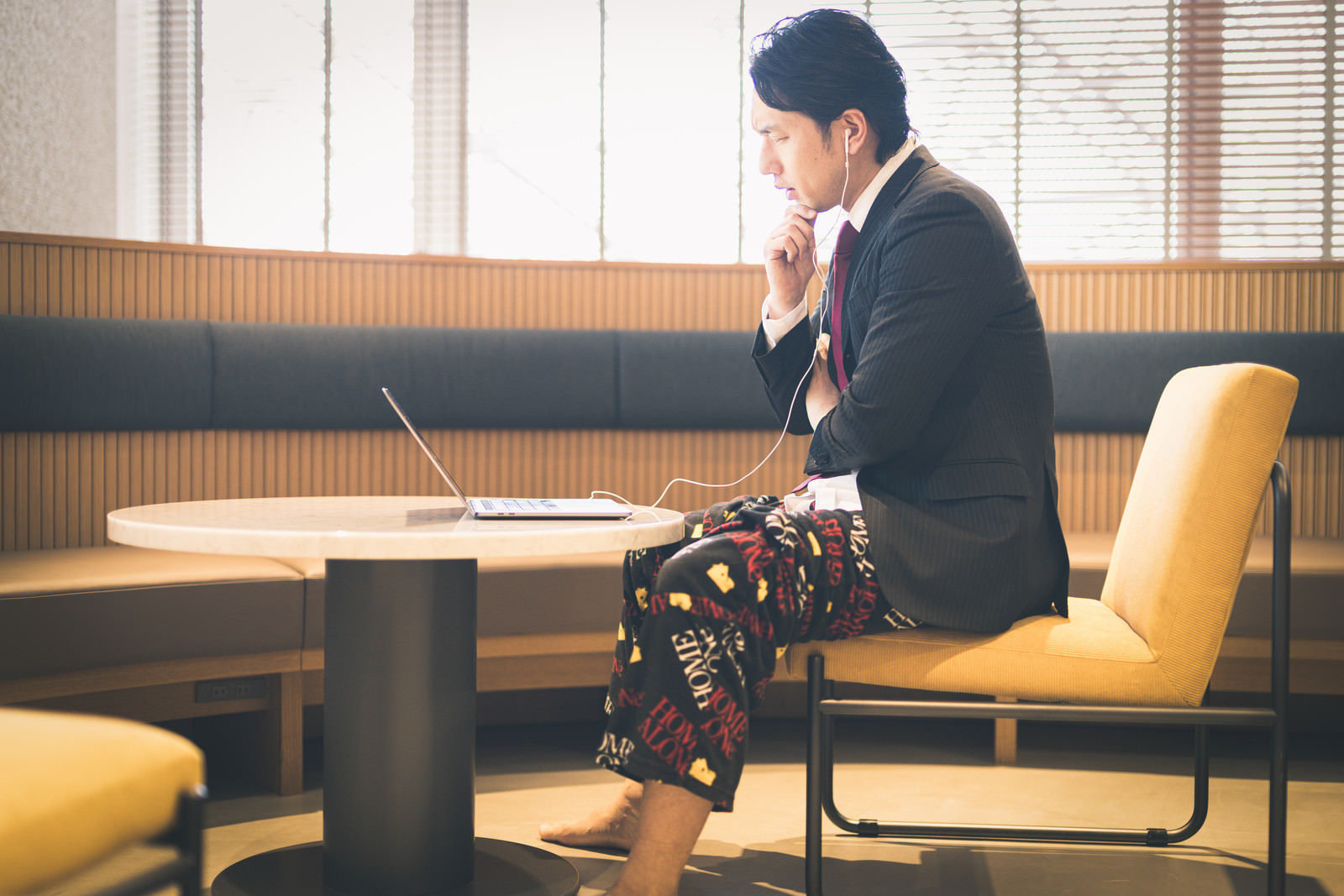リモート会議で上半身はスーツ、下半身はパジャマを着用した男性の写真素材です。オンライン会議の画面に映る上半身は正装で、見えない下半身はリラックスウェアという在宅ワークならではの光景を表現しています。リモートワーク関連のコンテンツやビジネス記事などにおすすめです。