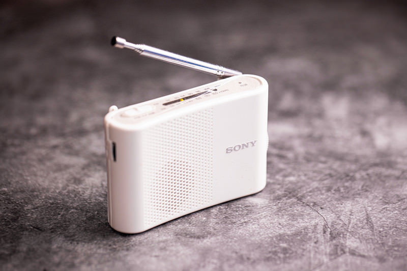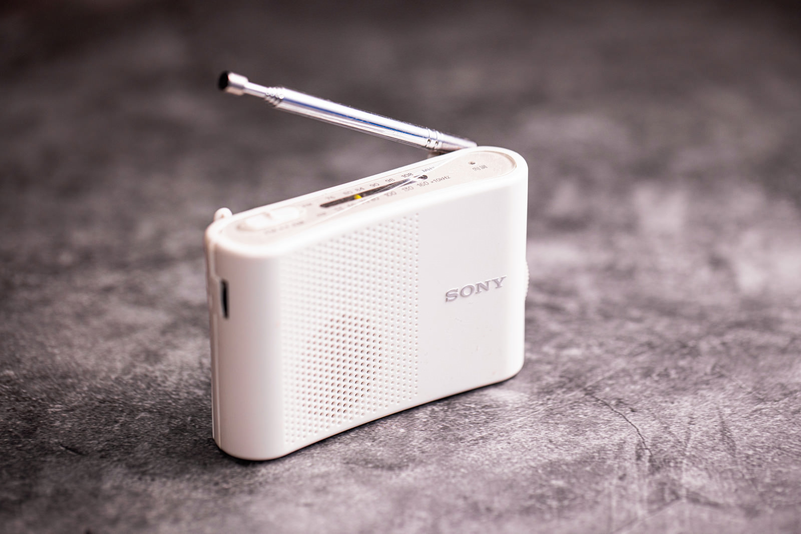 白いラジオの写真素材です。コンクリートの床に置かれた小型のラジオで、チューニングダイヤルが見え、金属製のアンテナが立てられた状態、無線放送の受信を可能にしています。ラジオ関連の記事やメディア、音響機器の紹介、懐かしい家電製品のコンテンツなどにおすすめです。