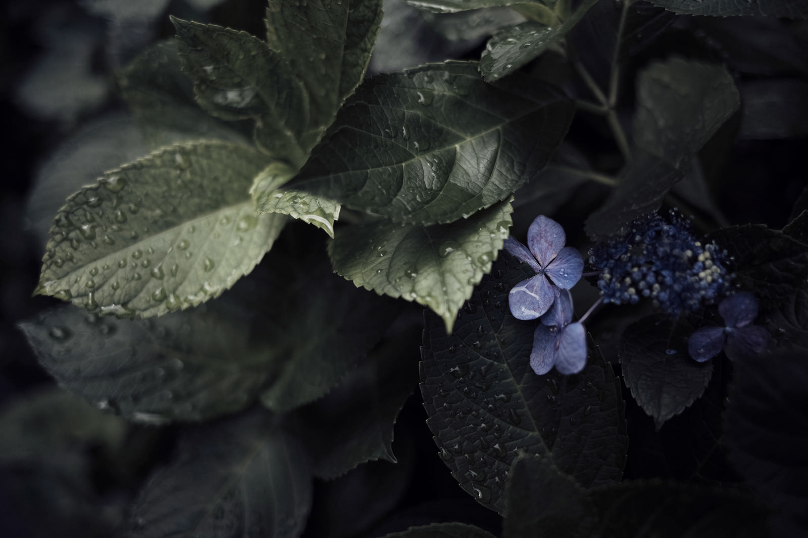 雨上がりの庭で撮影したアジサイの写真素材です。大きな葉に水滴が残り、青紫の小さな花が葉の間に咲いている。梅雨や雨の日をテーマにしたコンテンツにどうぞ。