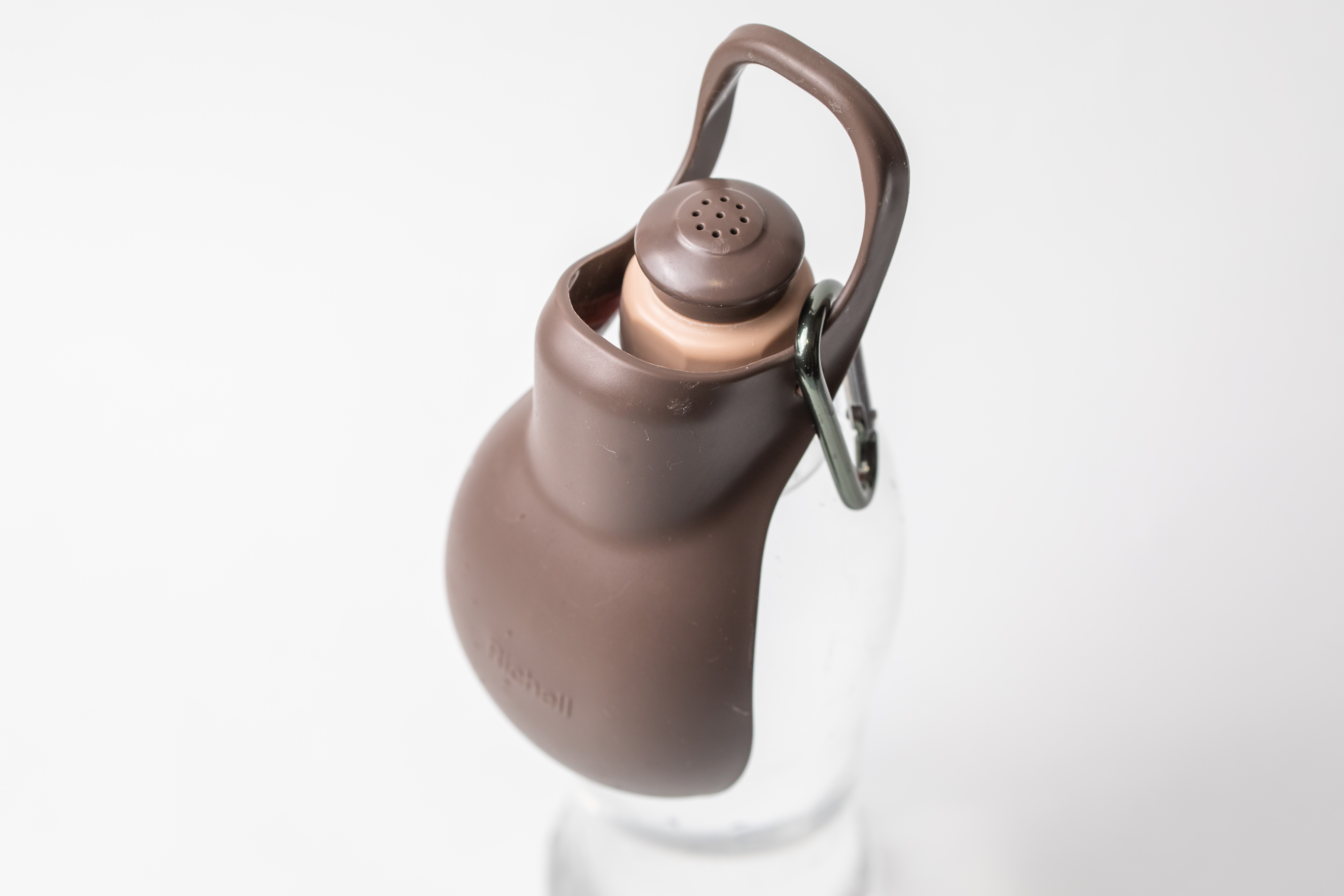 お散歩ハンディシャワーのシャワー部分の写真素材です。茶色のプラスチック製ボトルに黒い持ち手が付いており、細いシャワーノズルが上部に装着された状態で、シンプルで実用的なデザインになっています。ペット用品の紹介やお散歩グッズ関連のコンテンツ制作などにおすすめです。