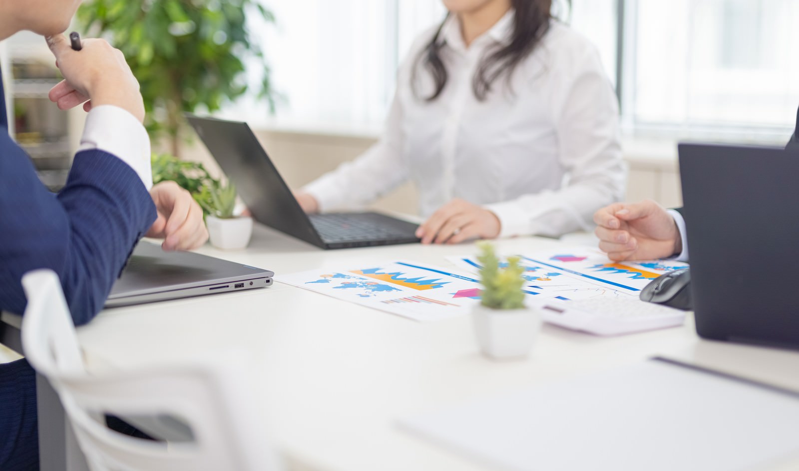 パソコンを囲んで打ち合わせをするビジネスパーソンの写真素材です。テーブルには資料やノートパソコンが置かれ、3人が真剣に議論している風景が写されています。企業の会議資料や研修教材、ビジネス関連のWebサイト、カンファレンス素材などにおすすめです。