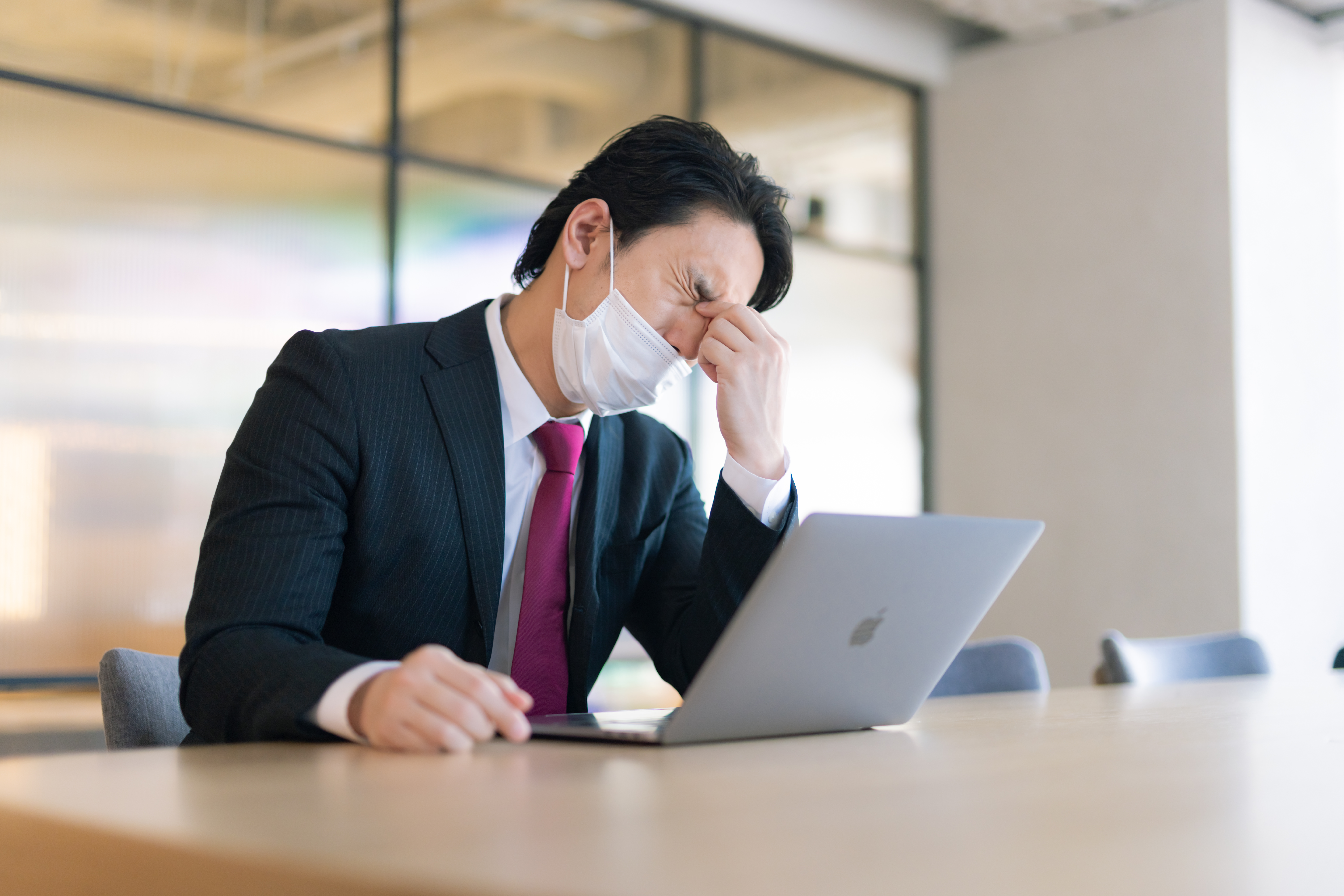デスクでノートパソコンを前に頭を抱える男性の写真素材です。スーツ姿の男性が頭部に手をあて、眼精疲労と頭痛による疲労感を示しており、会議や打ち合わせ後の疲弊した状態を捉えています。デスクワークの疲労やビジネスシーン関連のコンテンツ制作に活用できます。