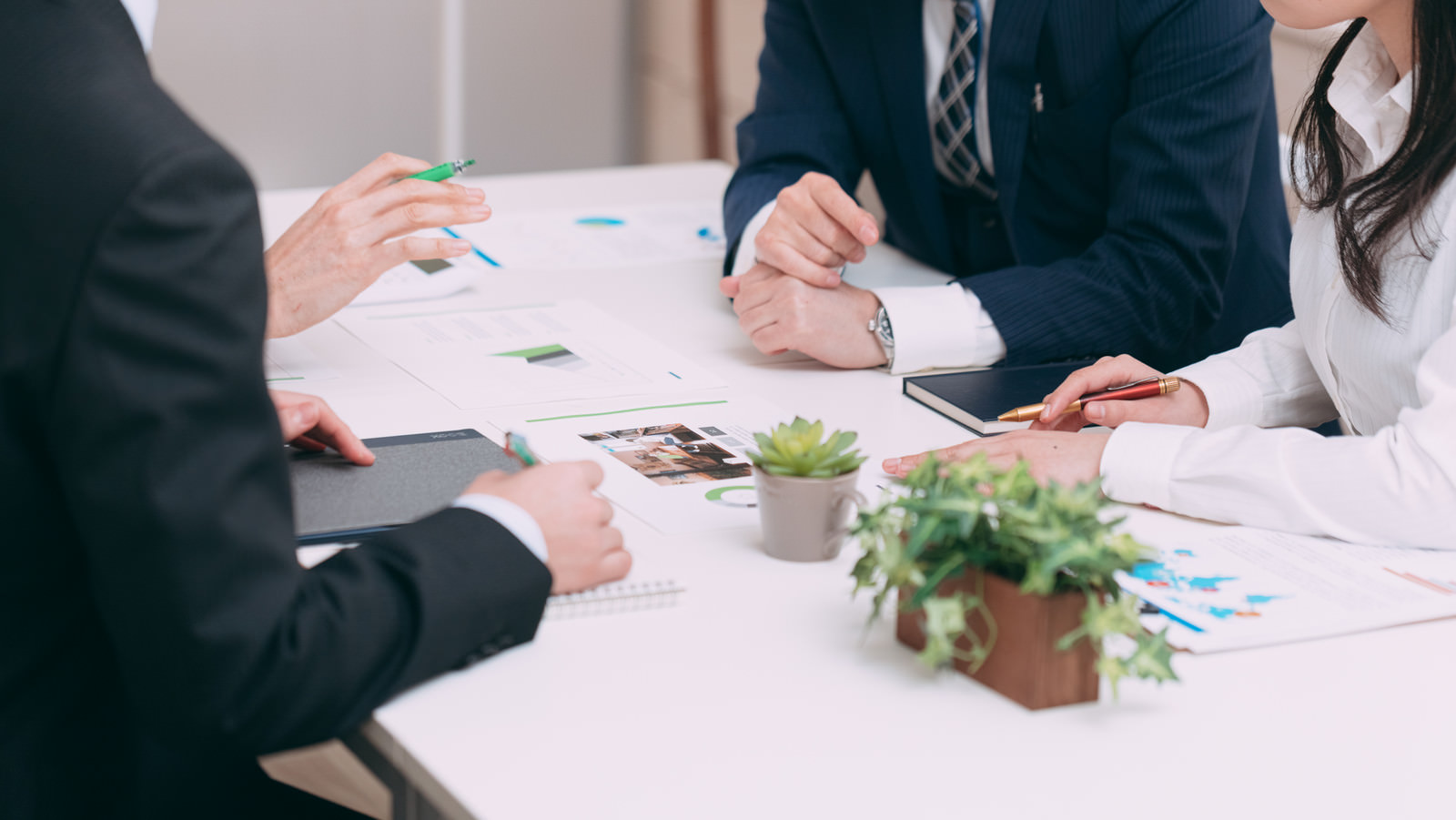 会議室で打ち合わせをするセールスチームの写真素材です。テーブルの上に資料を広げて複数人が着席し、話し合いながら説明・検討している風景で、観葉植物が置かれた落ち着いた空間となっています。営業会議やビジネス打ち合わせ、企業研修資料などに活用できます。
