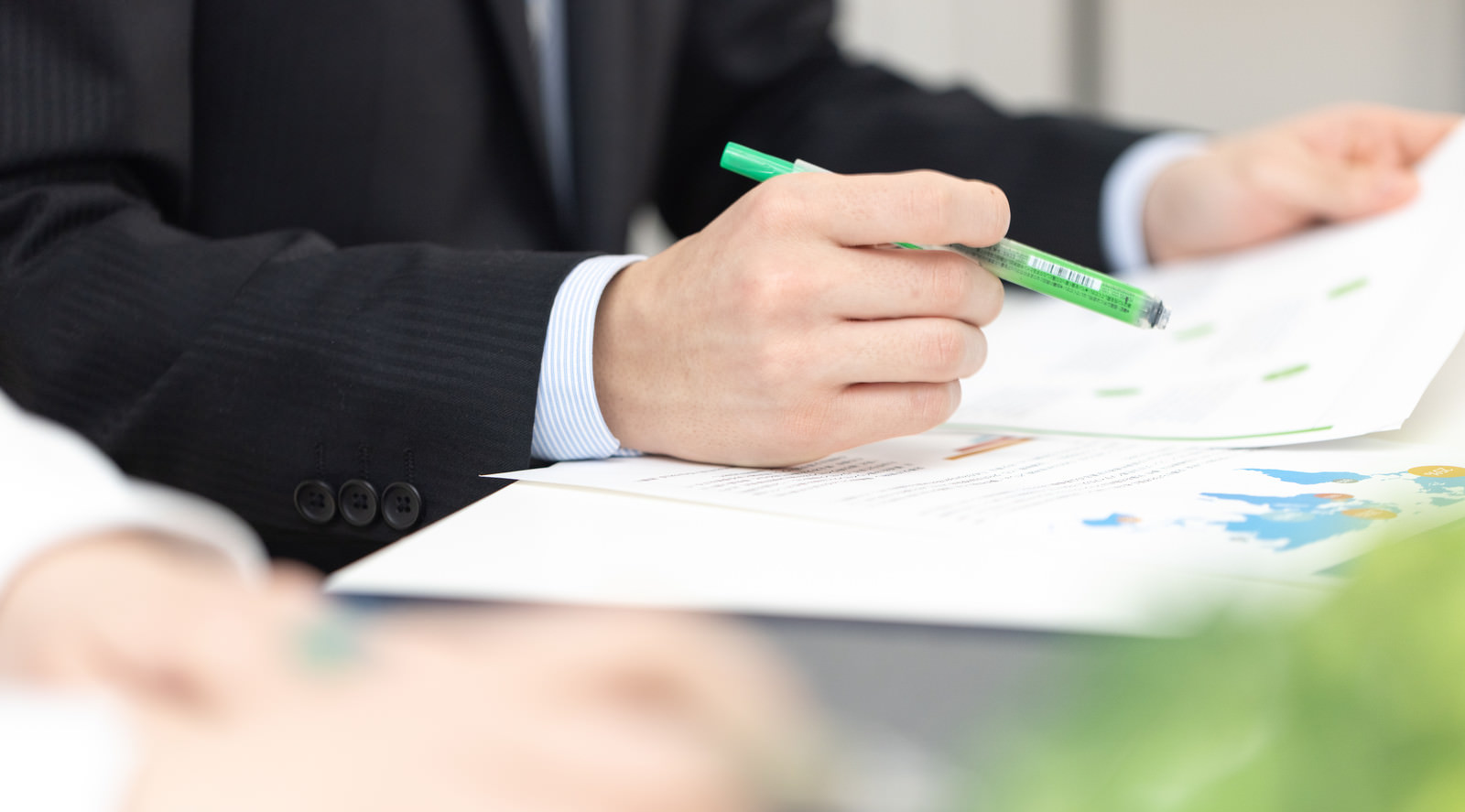 資料の誤植をチェックする担当者の写真素材です。スーツを着た男性がデスクで書類にペンを入れながら、会議資料や契約書の内容を確認しており、誤字脱字や記載漏れなどの最終チェック風景が捉えられています。プレゼン前の確認作業などにおすすめです。
