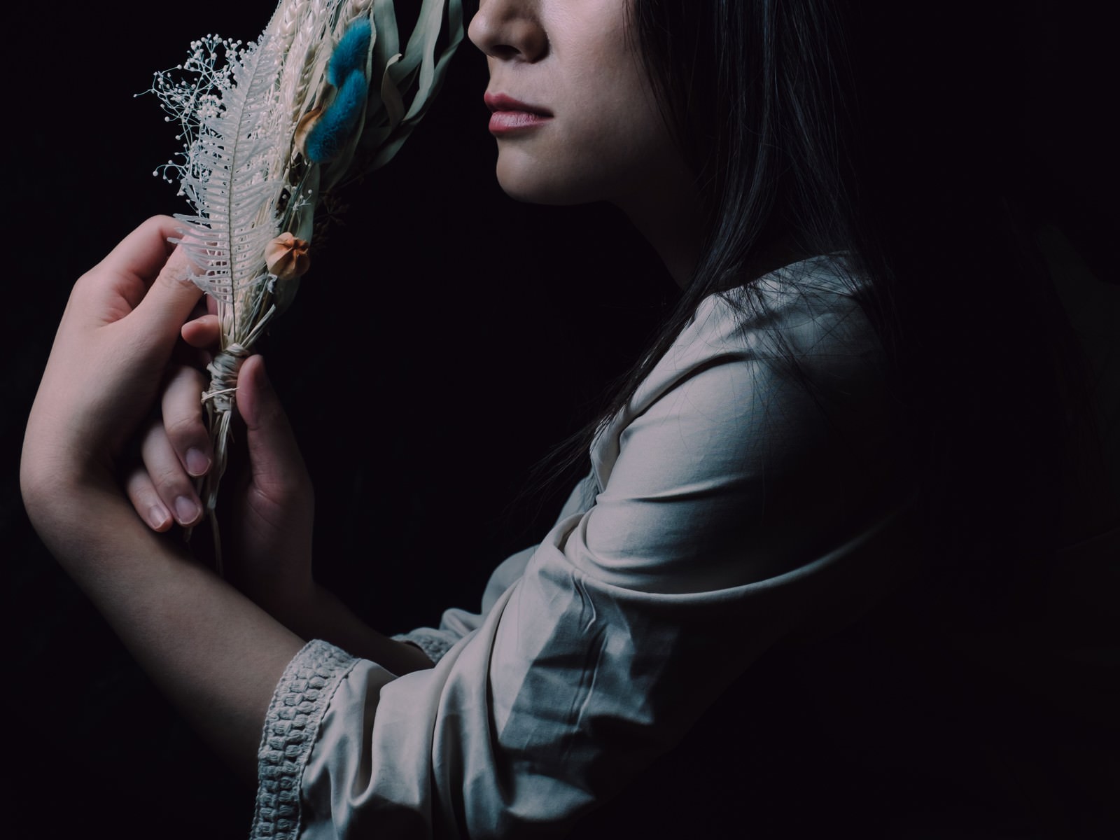 手に持ったスワッグを頬に寄せる女性の写真素材です。造花を束ねたスワッグを両手で持ち、横顔に優しく寄せており、ドライフラワーの質感が近くで見えています。女性らしい柔らかな表情とスワッグの色合いが調和した一枚で、ポートレート撮影やフラワーアレンジメント関連のコンテンツ制作などにおすすめです。