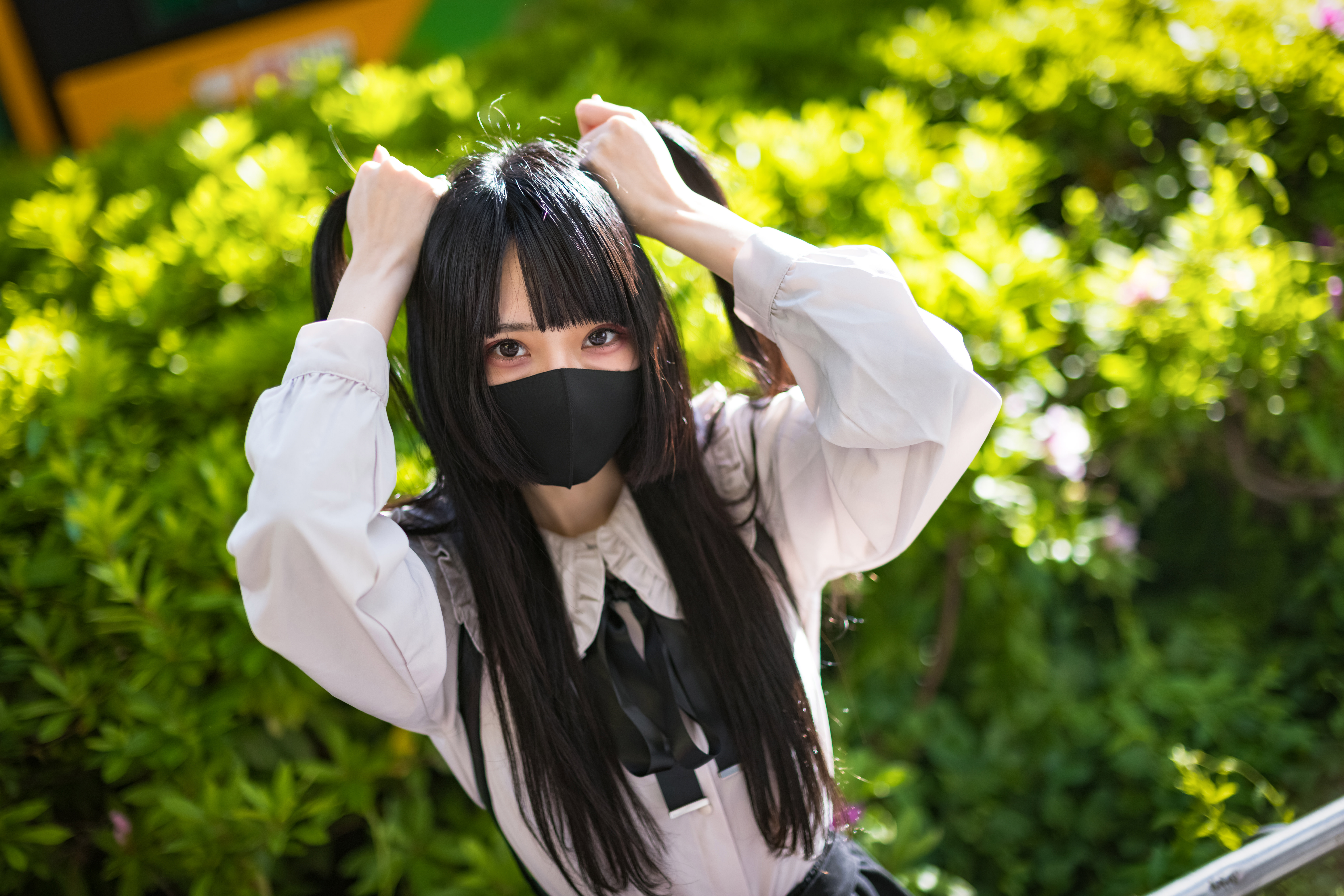 マスク姿でポーズを取る地雷系女子の写真素材です。ツインテール、黒髪で白いブラウスを着た若い女性がマスクを装着し、緑豊かな屋外でカメラ目線のポーズを決めています。地雷系ファッションの魅力を引き出した撮影で、若者向けのコンテンツやSNS投稿などにおすすめです。