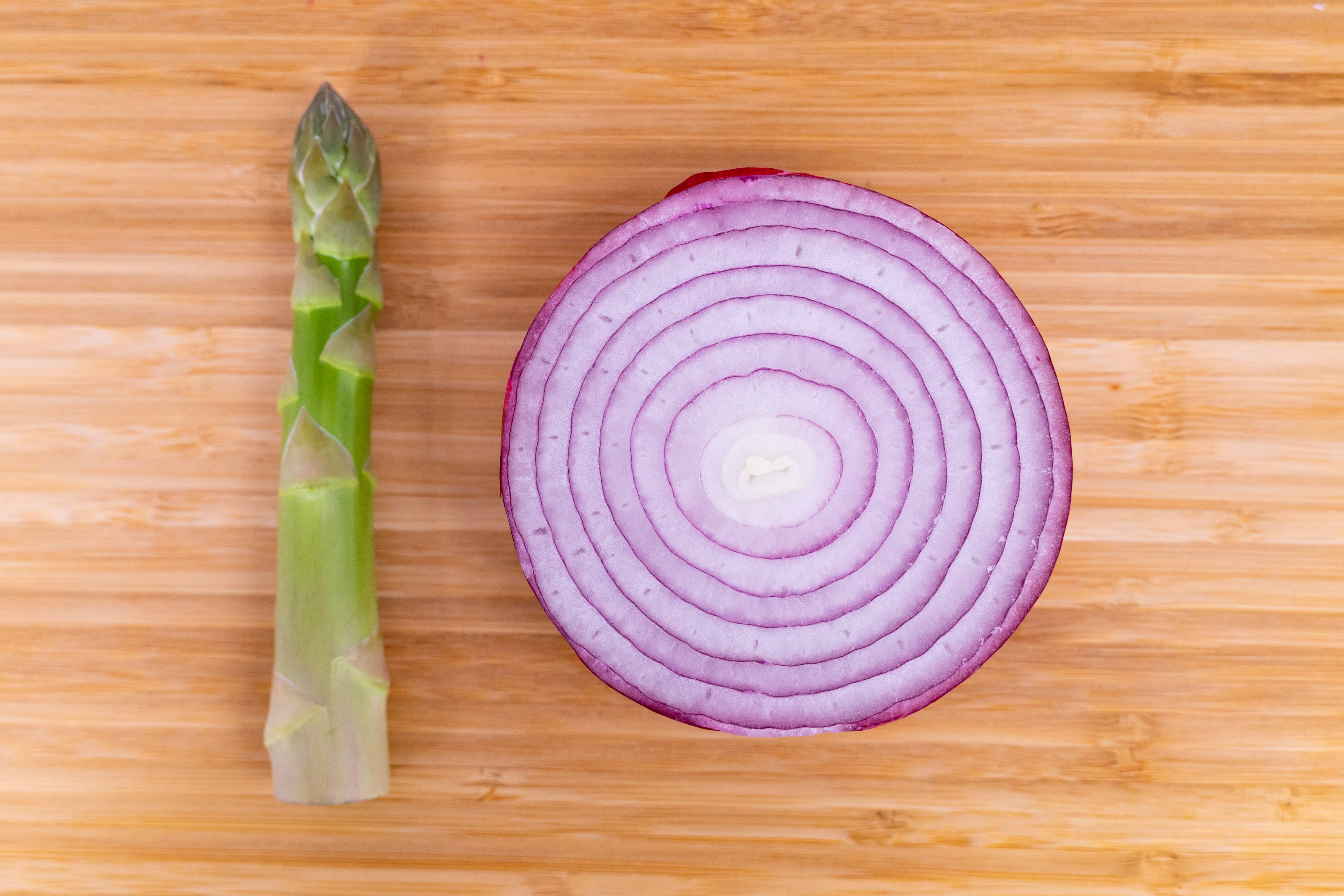 アスパラと玉ねぎで作った「10」の写真素材です。木製のまな板の上に緑のアスパラガス1本と紫玉ねぎの輪切りを並べて数字の10を表現しており、10周年やアニバーサリーのデザイン素材などにおすすめです。野菜を使った創意工夫のある表現は、企業記念日やイベント告知などの視覚的な演出に活用できます。