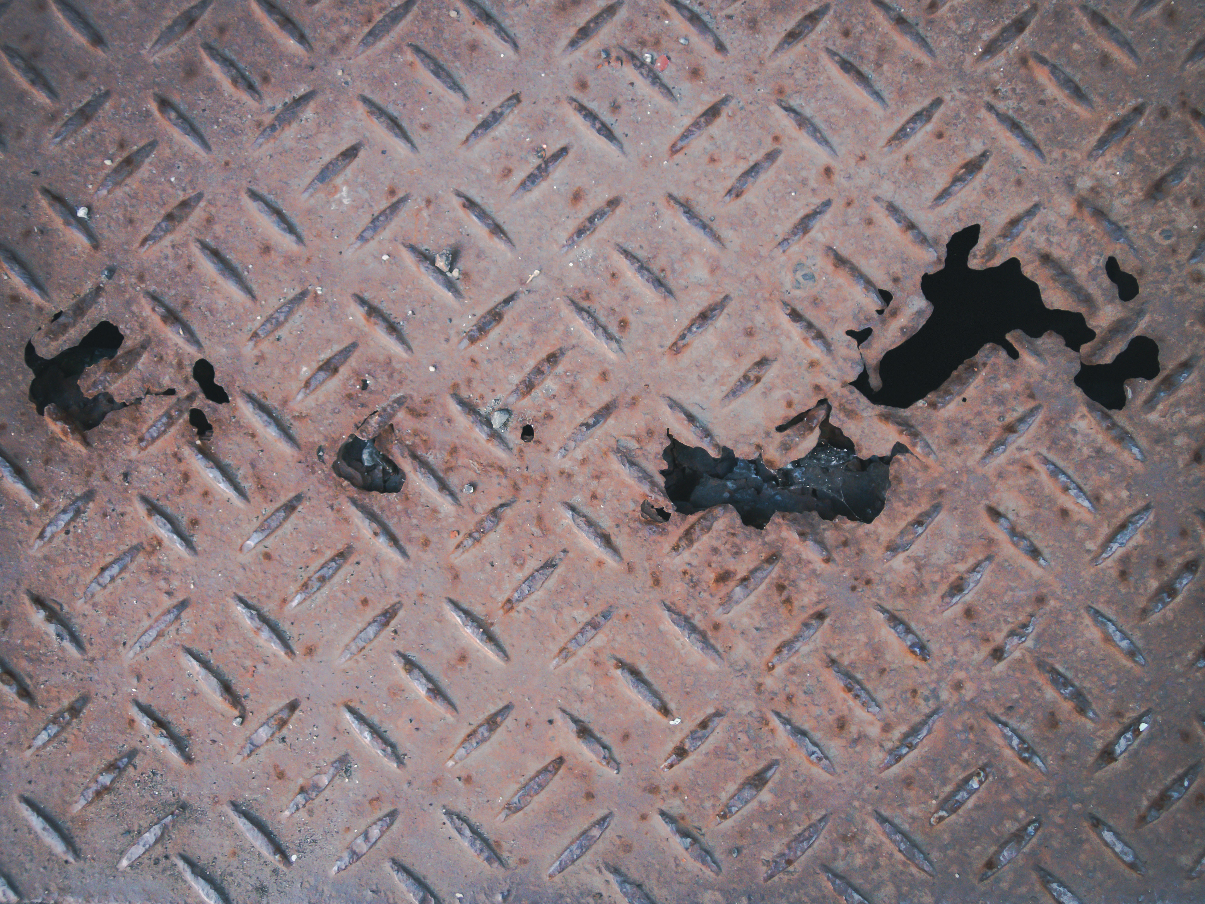 錆びて穴が空いた金属の足場の写真素材です。茶色く錆びた鉄製の足場に複数の穴が開いており、腐食が著しく進行した劣化状態が確認できます。工業系デザインや老朽化・廃墟をテーマにした制作に最適です。