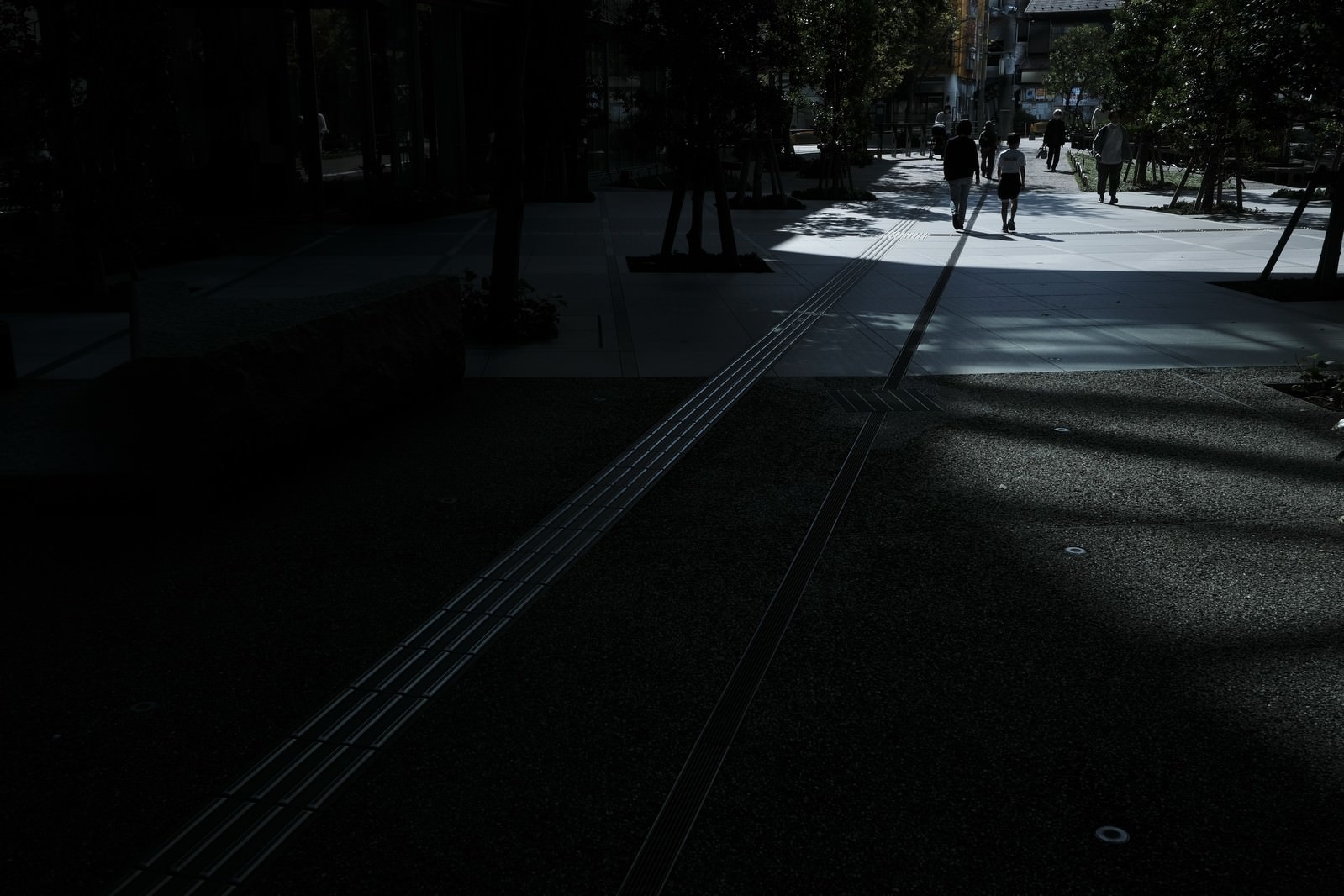 暗い街の歩道を歩く人々のシルエットの写真素材です。街灯の光が地面に影を落とす歩道で、逆光によって通行人が黒くシルエット化しています。都市風景や夜間の街並み、人物シルエット素材として活用できます。
