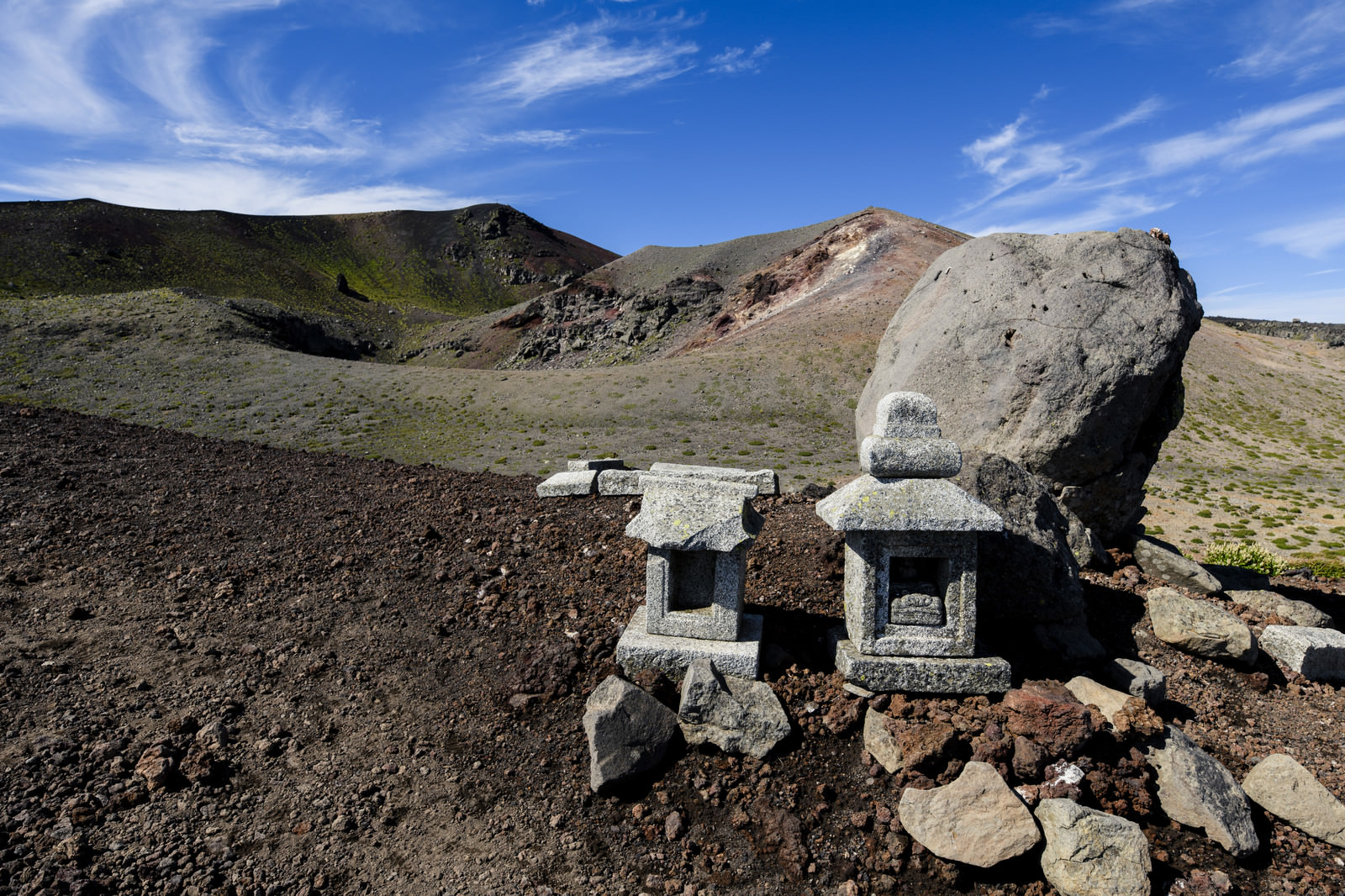 岩手山の山頂に建つ石造りの社の写真素材です。荒涼とした岩場に石で組まれた小さな社が佇み、青空と白い雲海が広がる雄大な景観を呈しており、日本百名山の登山記録やアウトドア関連のWebサイト、旅行パンフレット、山岳ブログなどにおすすめです。