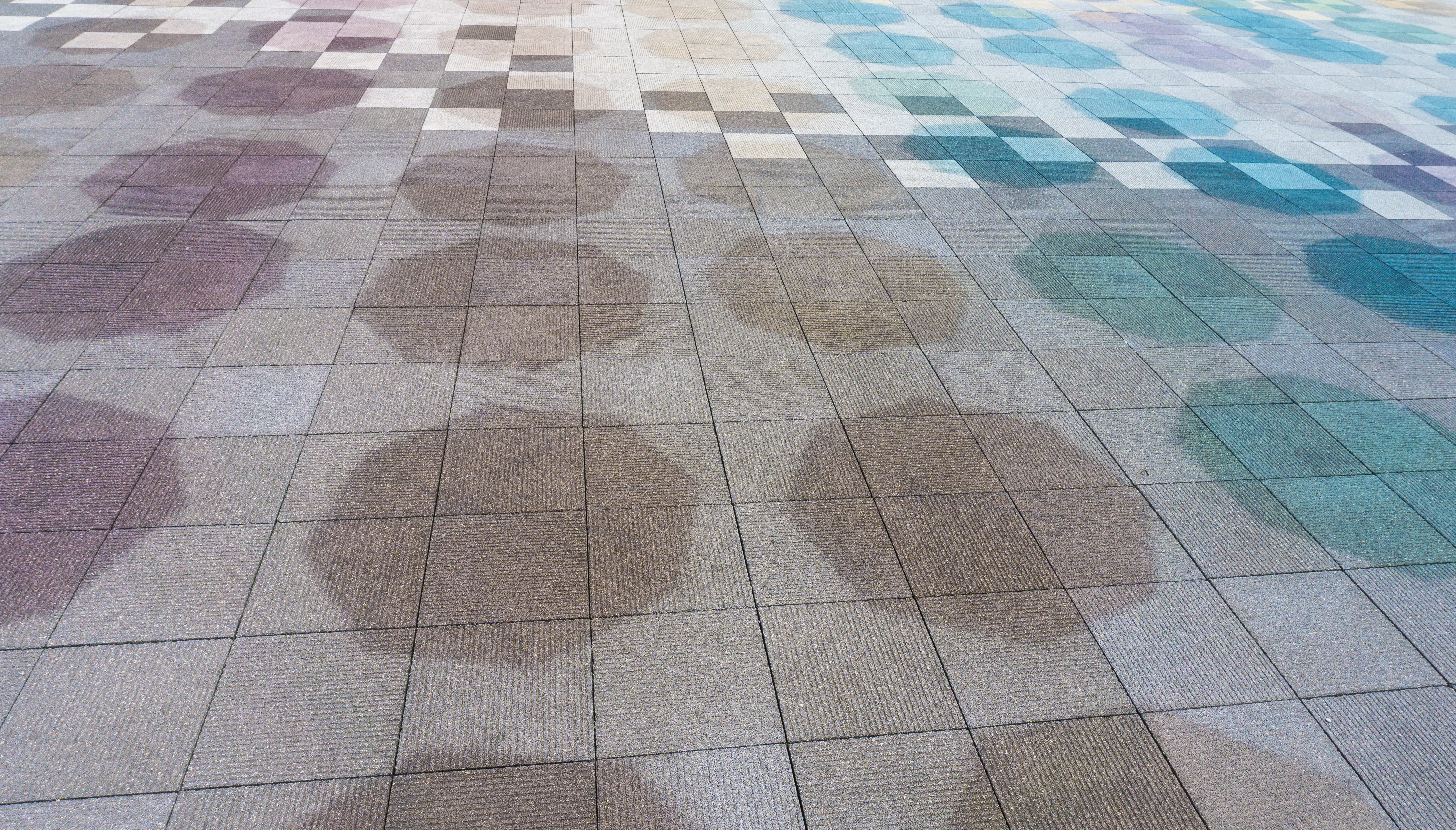 地面に映る傘の影の写真素材です。岐阜県大野町の道の駅パレットピアおおので撮影した、赤や青、黄色などカラフルな傘が石畳に落とす影が広がっており、梅雨の季節や雨の日の風情を表現する素材として活用できます。