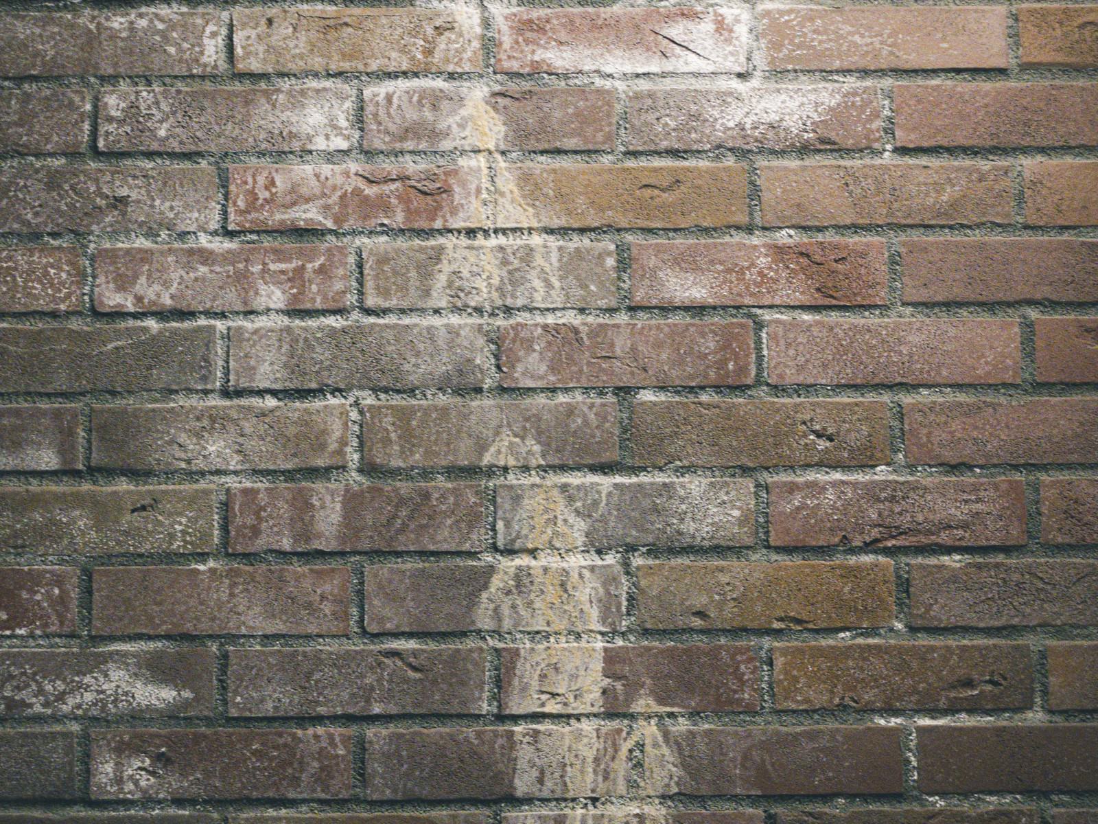 薄汚れた外壁のテクスチャーの写真素材です。赤茶色の煉瓦が積み重なった壁面に、経年劣化による汚れや色ムラが見られ、古い建物の風合いを表現しています。建築物の背景やテクスチャー素材、デザイン素材などにおすすめです。