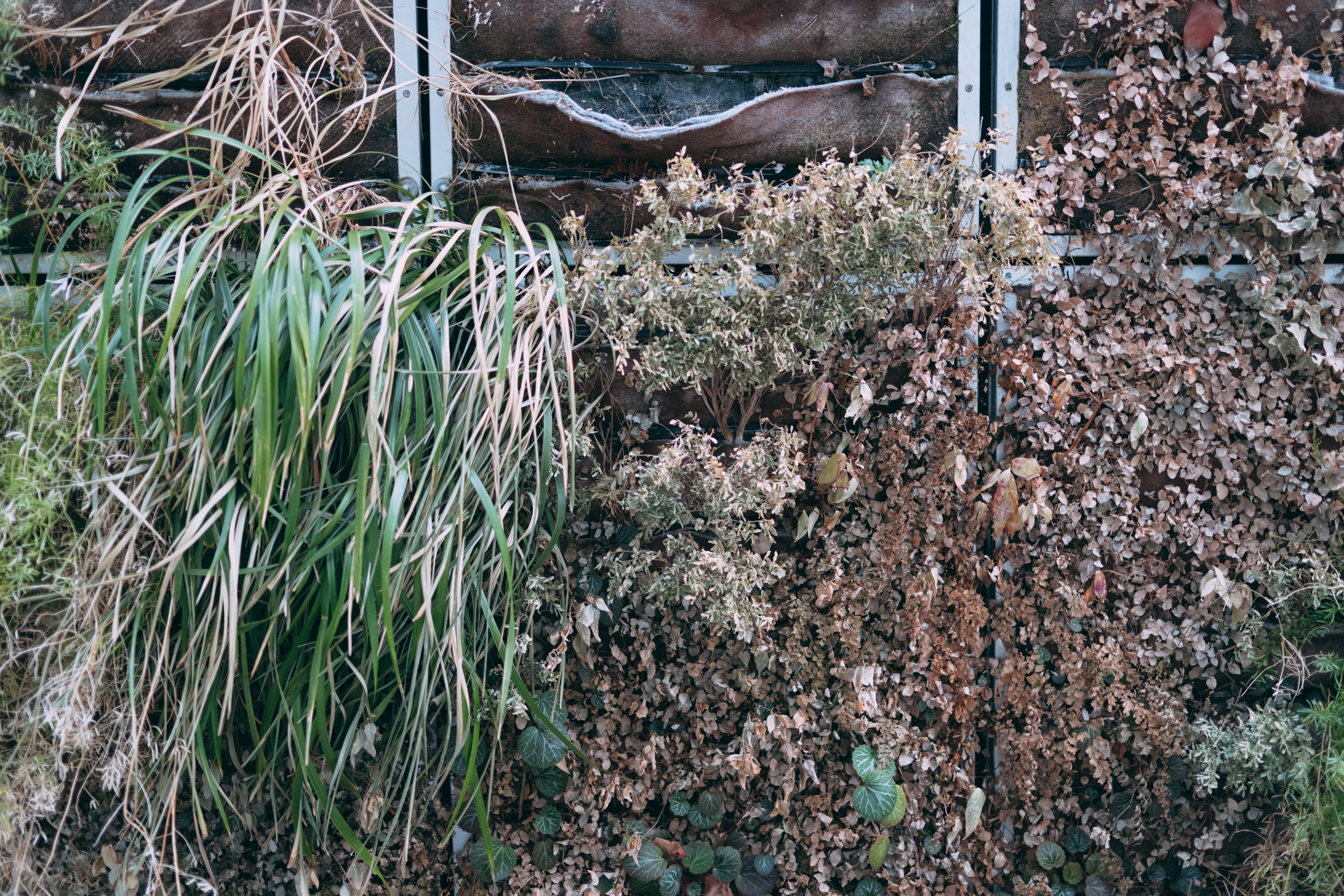 荒れた縦型の植栽の写真素材です。緑の雑草が部分的に生え、周囲は茶色い土や落ち葉で覆われており、植栽全体が荒廃した状態になっています。環境問題や自然環境の変化、荒廃地のイメージを表現するコンテンツに最適です。