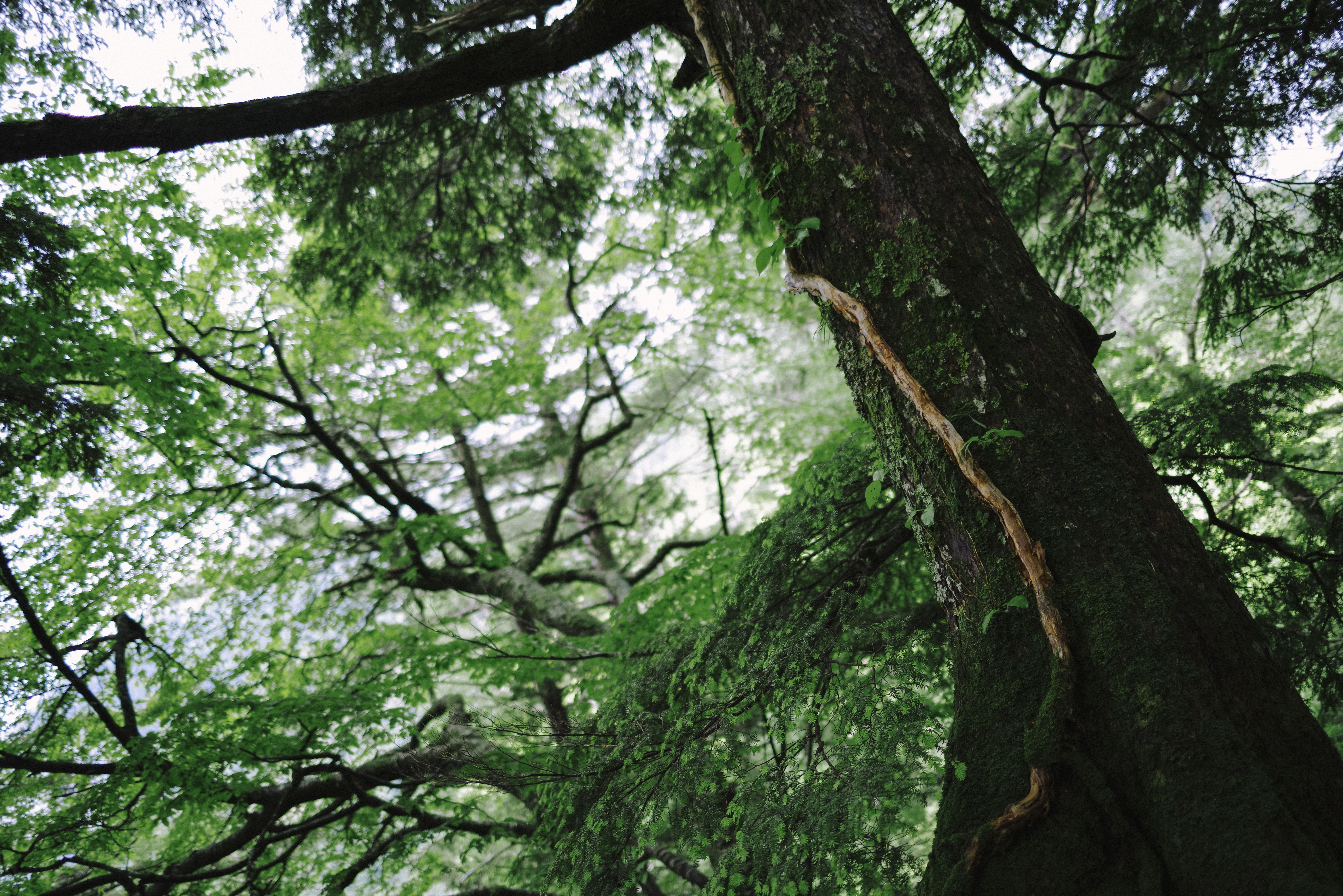 焼岳の大木にまとわりつく木々の写真素材です。日本百名山に数えられる焼岳の太い幹を持つ大木に、他の樹木が絡みつき、深い緑色の森が広がっています。登山やハイキング、自然風景のWebサイト制作やブログ、アウトドア関連のデザイン素材におすすめです。